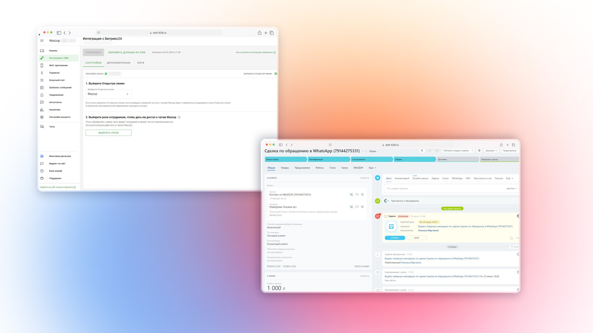 Чтобы не ломать привычный стиль общения с покупателями, интегрировали мессенджеры через Wazzup, поэтому все чаты и переписки сохранились в системе, а история взаимодействий с клиентом всегда под рукой.