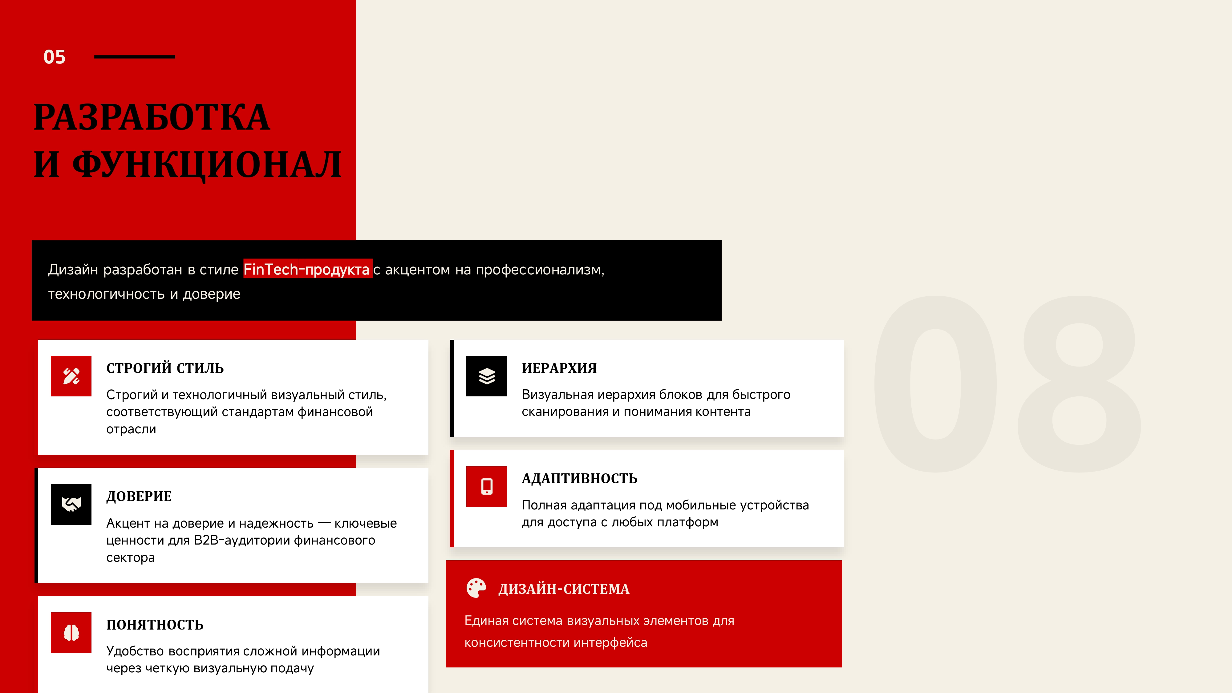 Дизайн был разработан в стиле FinTech-продукта с акцентом на: