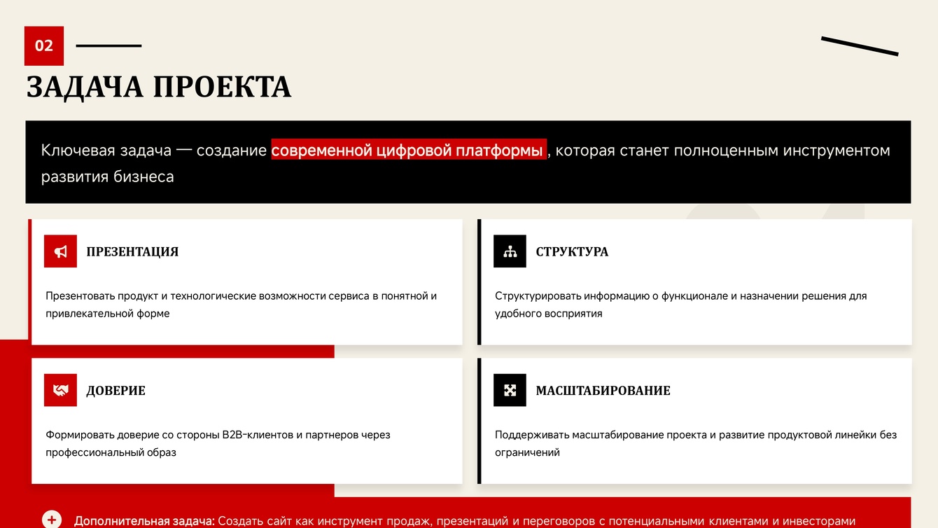 Дополнительно стояла задача создать сайт, который можно использовать как инструмент продаж, презентаций и переговоров с потенциальными клиентами и инвесторами.