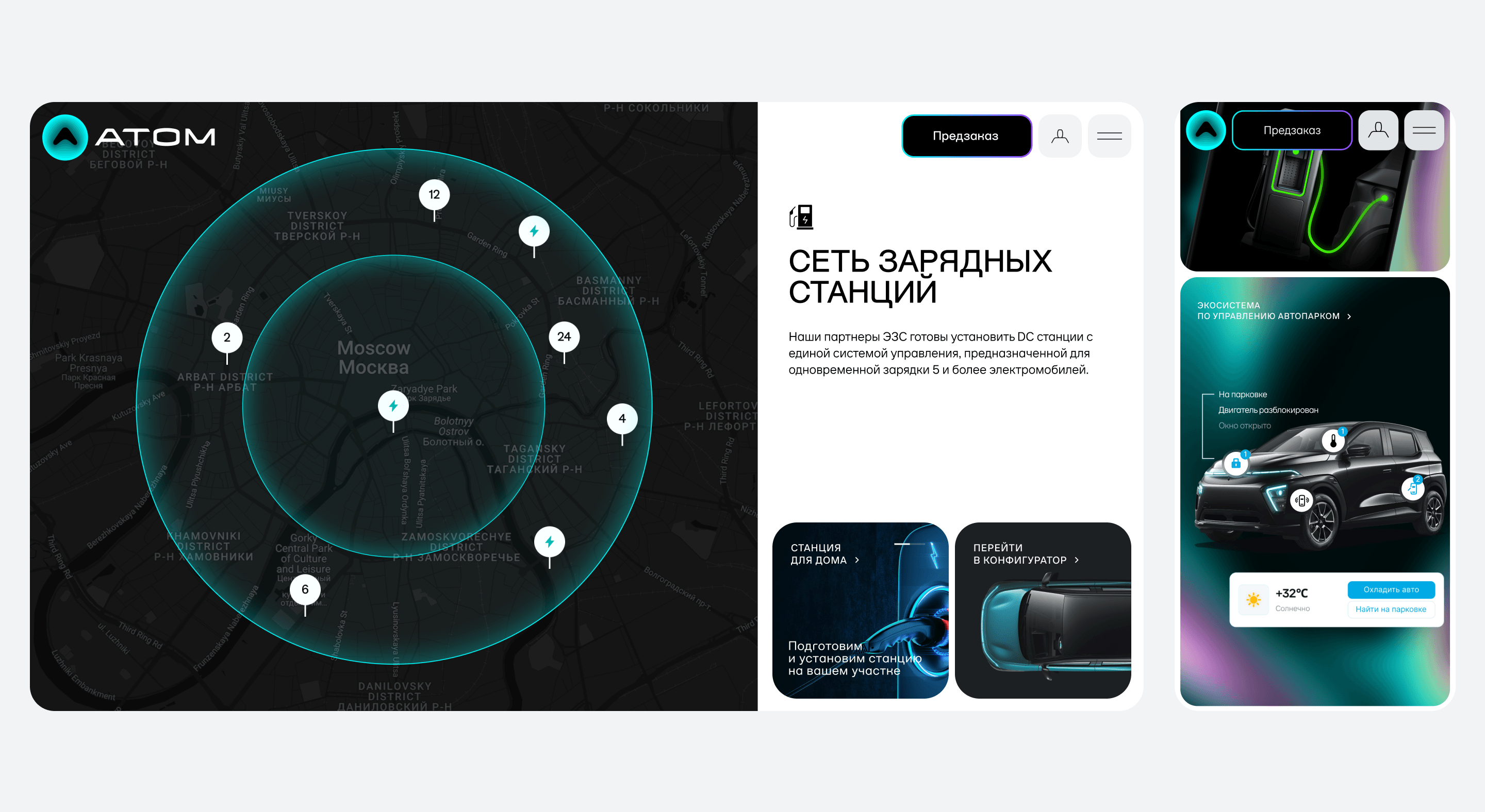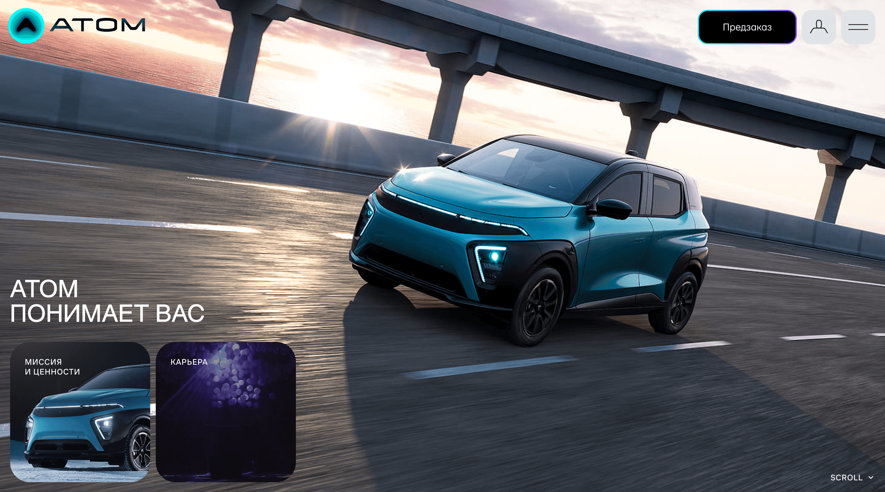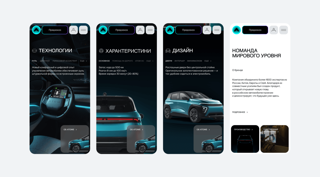 Команда Атома сразу отказалась от классической логики автомобильных сайтов с каталогом характеристик и акцентом на продаже товара. Важно было показать не просто машину, а идею цифровой экосистемы городской мобильности, в центре которой — электромобиль.