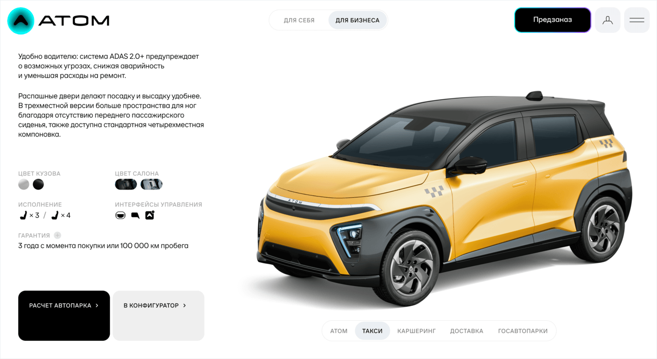 Атом — амбициозный бренд российских электромобилей. Компания рассматривает машину не просто как средство передвижения, а как часть экосистемы городской мобильности: она может использоваться как личный транспорт, каршеринг или такси, а все сценарии объединяются в единую инфраструктуру и пользовательский аккаунт.
