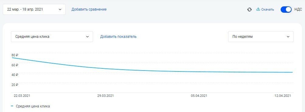 Динамика снижения стоимости клика в периоде, разбивка по неделям: