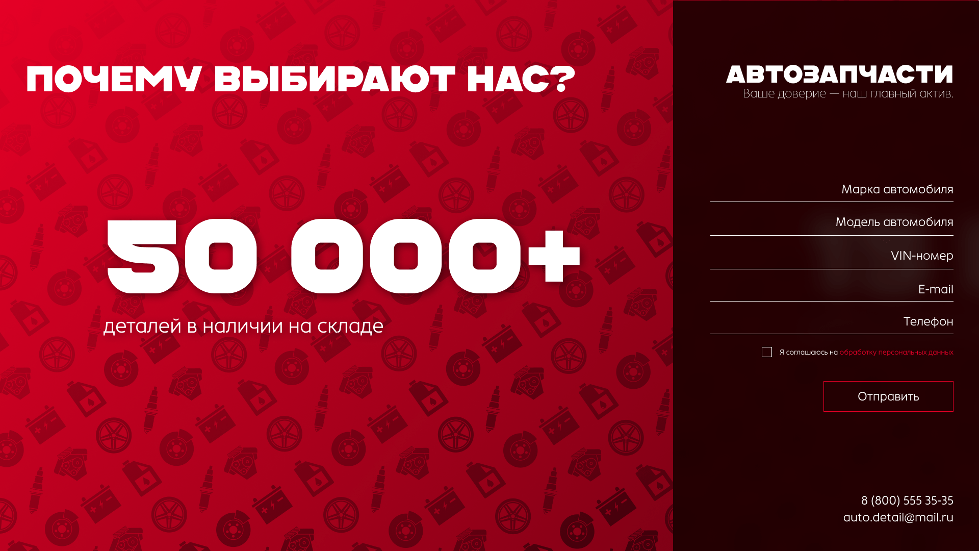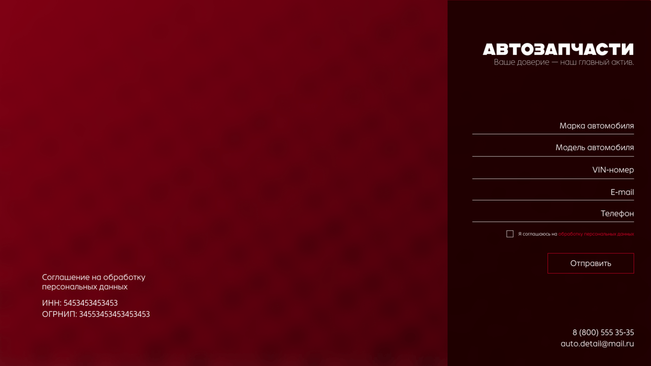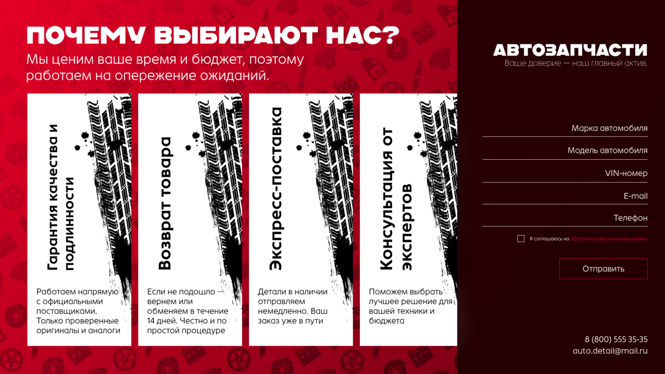 Компания-поставщик автозапчастей, ориентированная на современный рынок и быструю коммуникацию. Им важно было выделиться среди конкурентов со стандартными сайтами и предложить клиенту новый опыт взаимодействия.