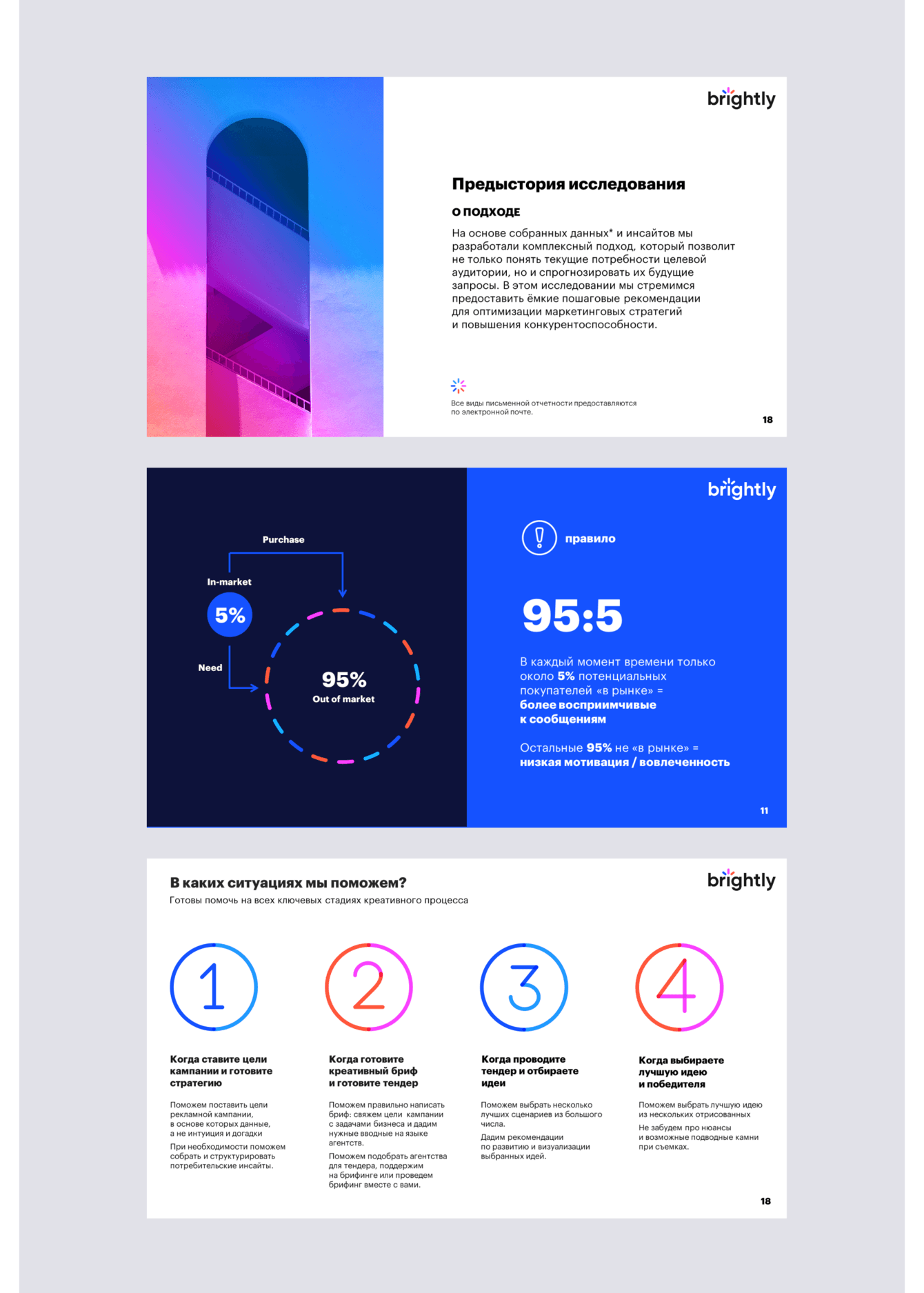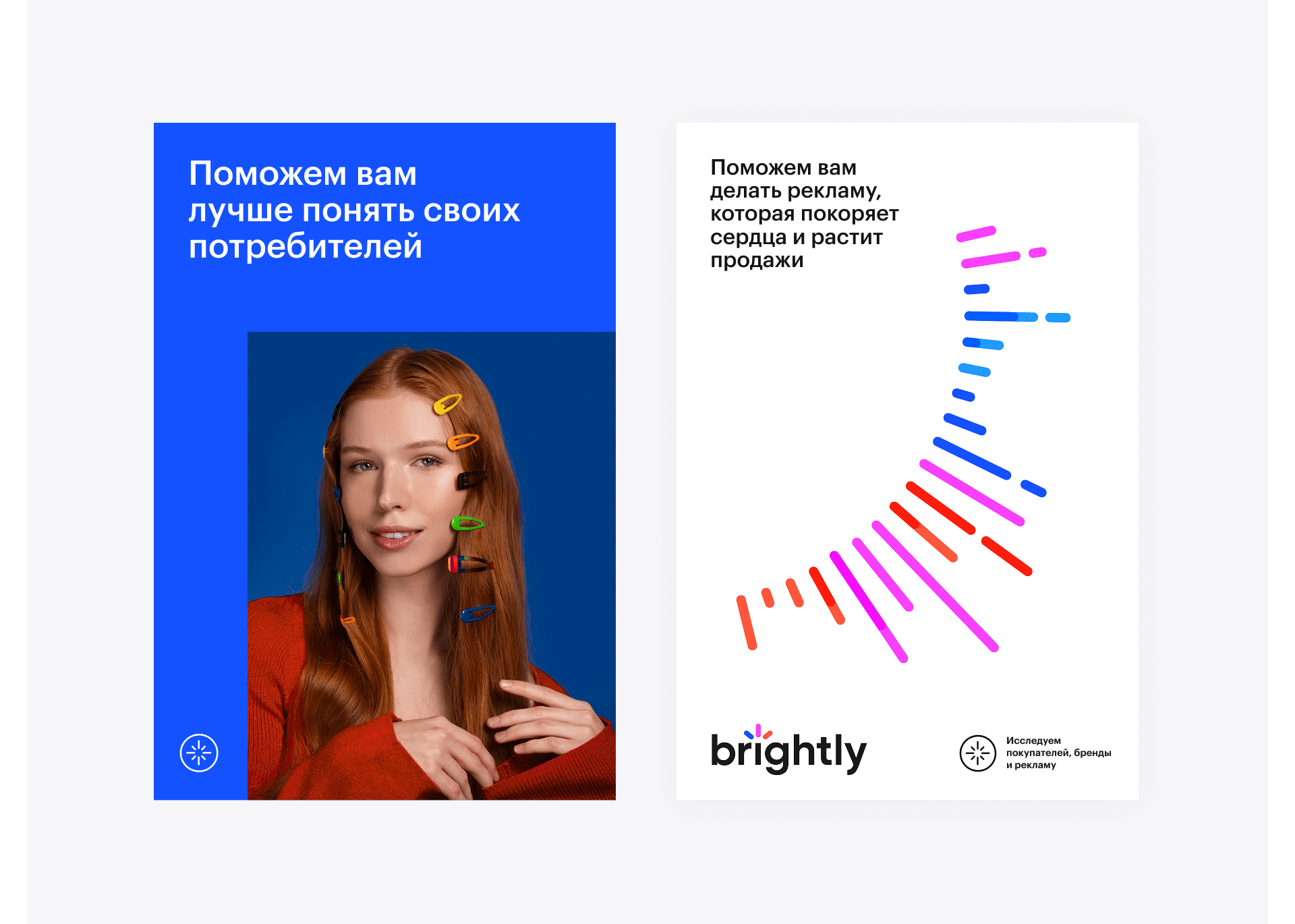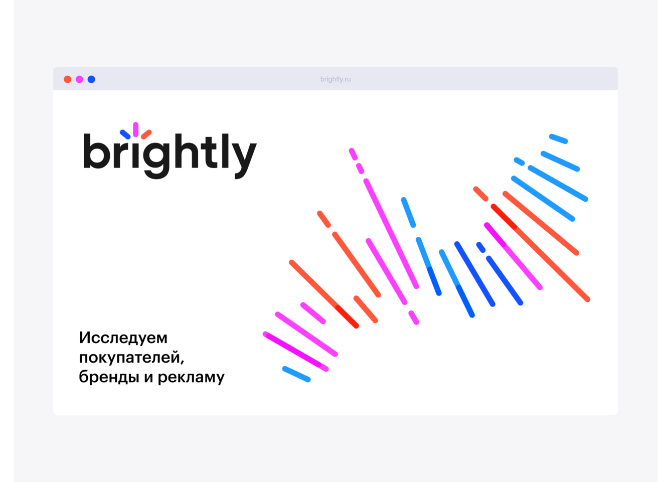 brightly - агентство маркетинговых исследований, которое специализируется на изучении аудитории, тестировании креатива и анализе эффективности рекламы. Яркое название стало отправной точкой для создания яркого и оптимистичного дизайна бренда.