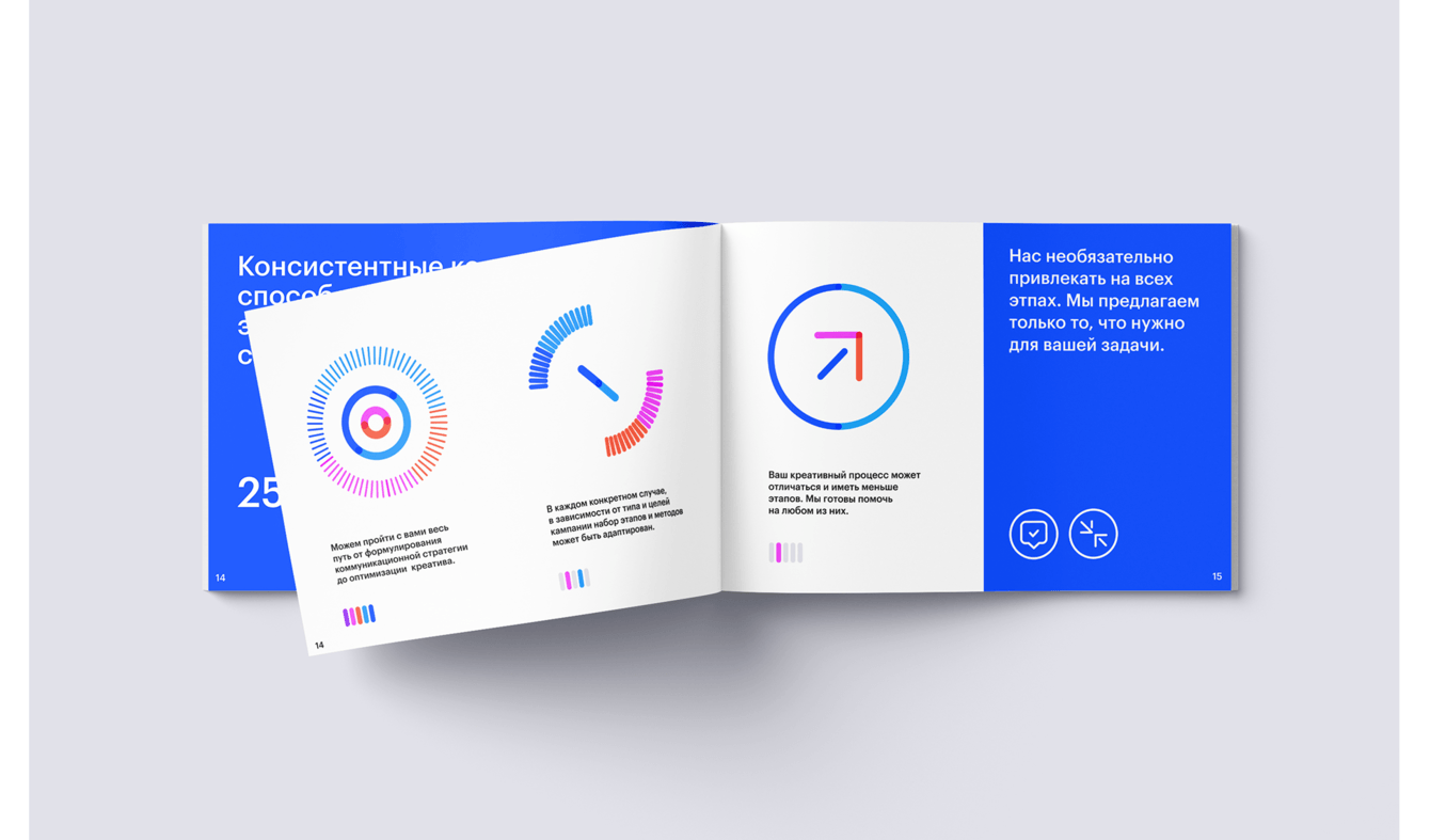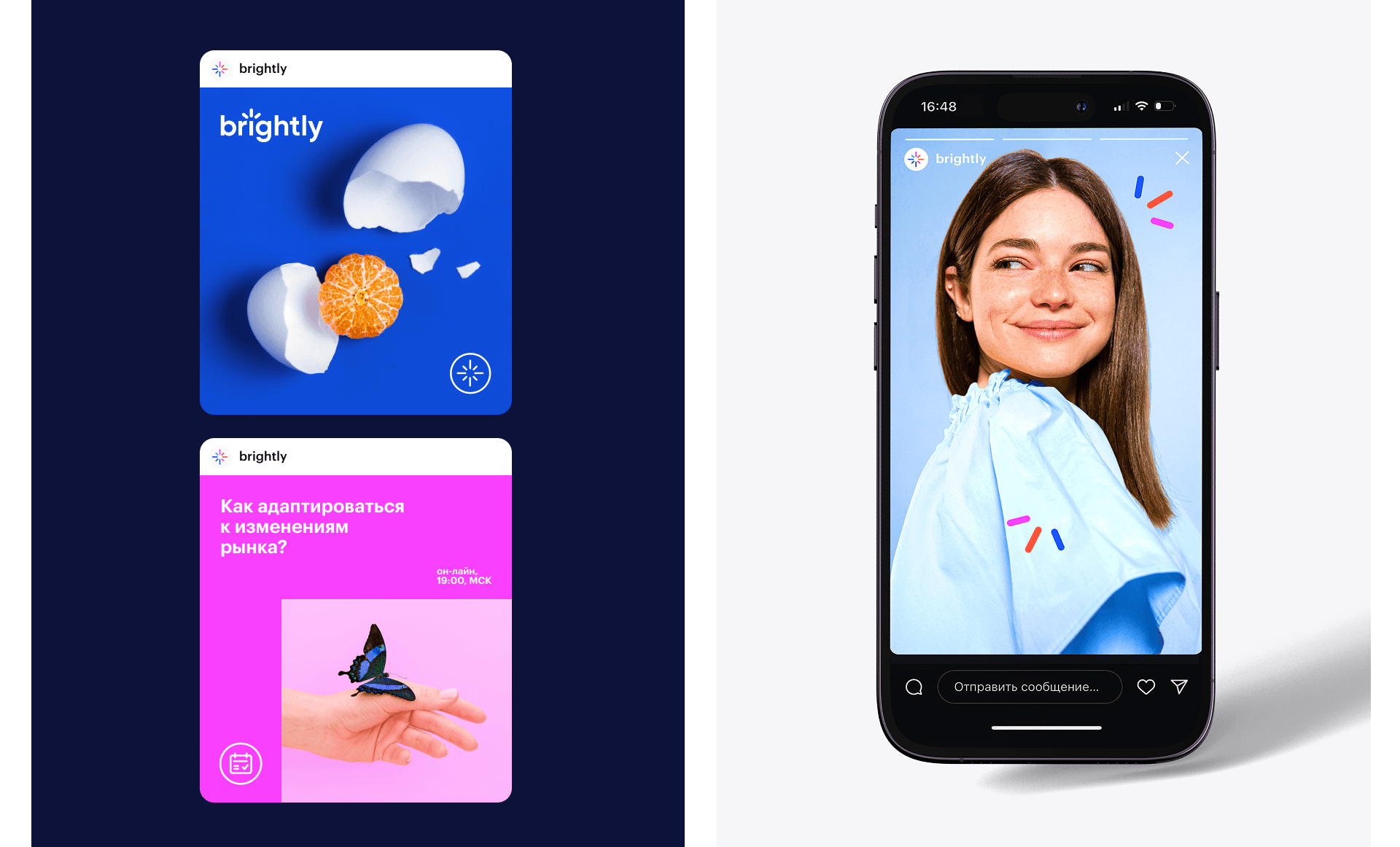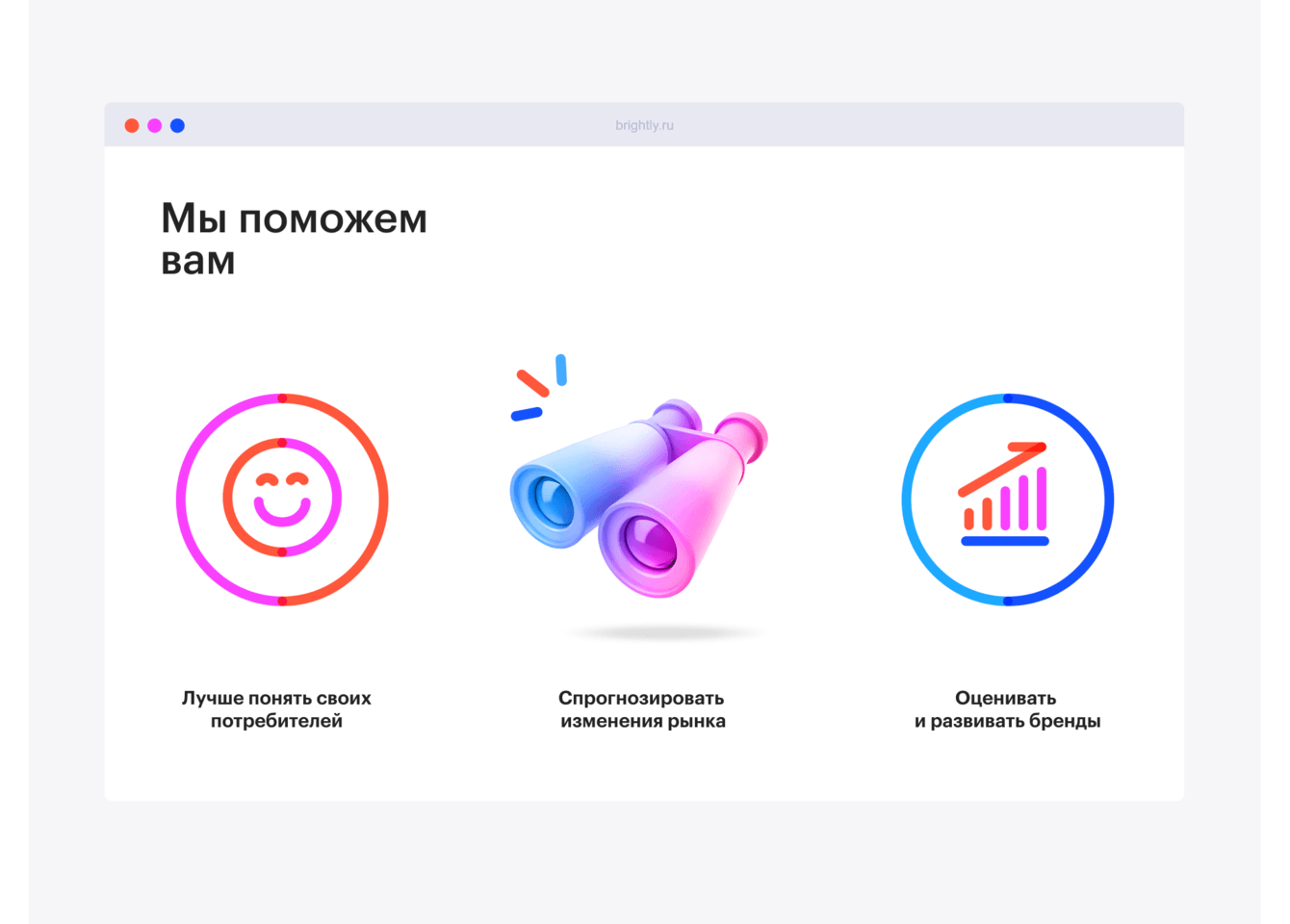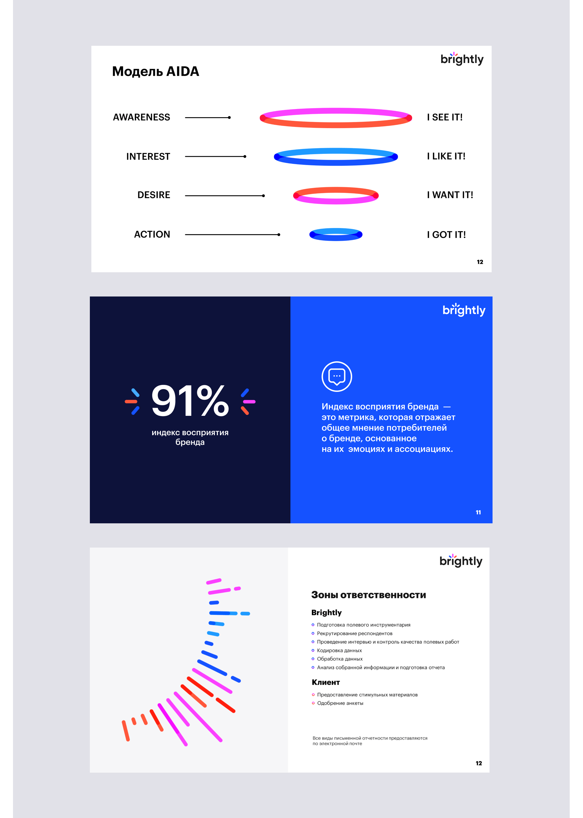 brightly - агентство маркетинговых исследований, которое специализируется на изучении аудитории, тестировании креатива и анализе эффективности рекламы. Яркое название стало отправной точкой для создания яркого и оптимистичного дизайна бренда.