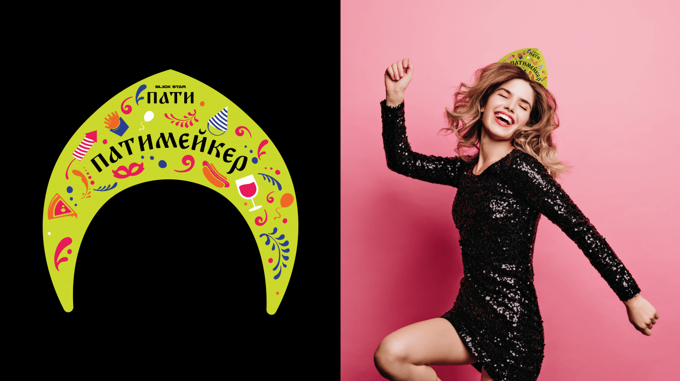 Помимо логотипа, мы разработали целый набор атрибутики, формирующей целостную атмосферу вечеринки: стикеры и наклейки, пати-бокс, кокошник, брендированные салфетки, ленты, воздушные шары с фирменным дизайном и другие элементы.