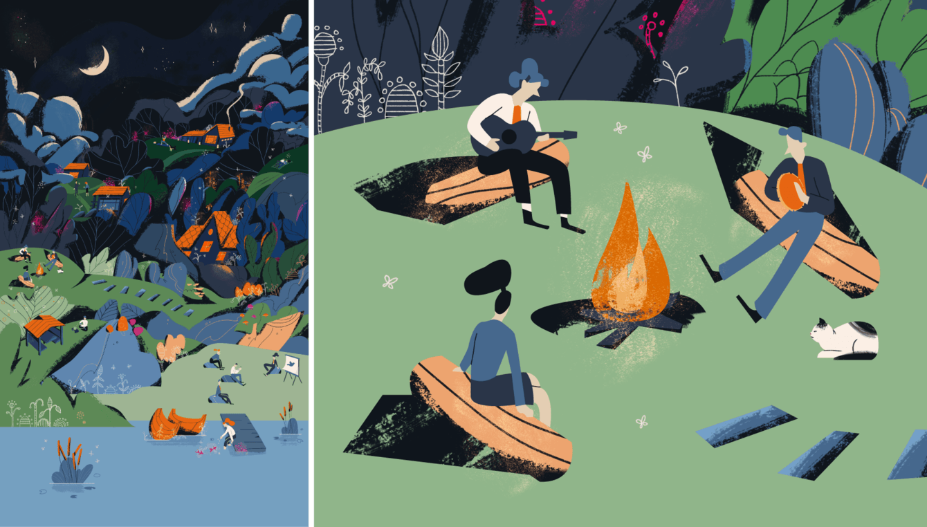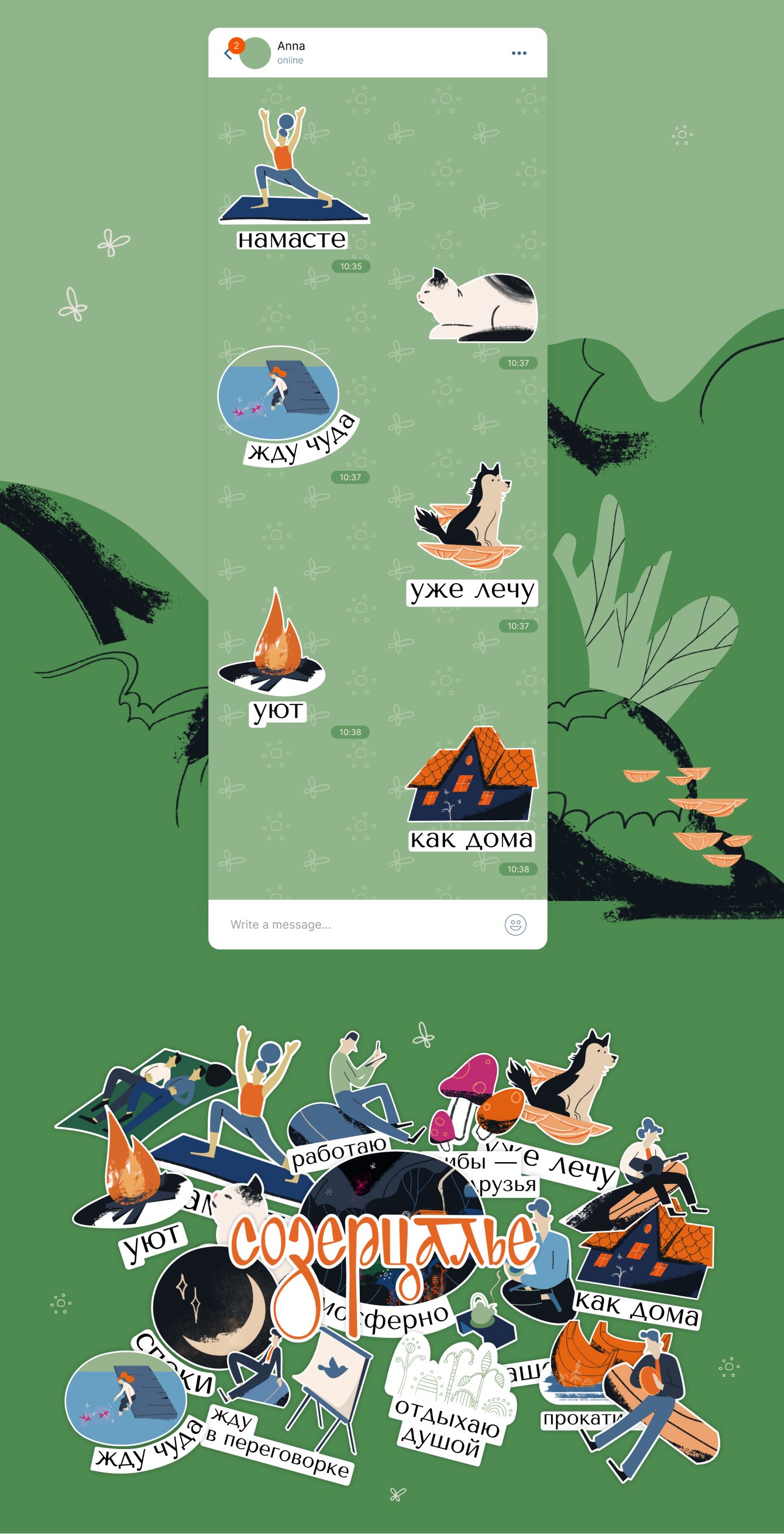 Главным элементом айдентики бренда стала фирменная растровая иллюстрация. Мы сознательно выбрали растр, так как хотели добавить больше крафтовости и уюта изображению за счет шума и текстур. Сюжет иллюстрации отсылает к сказочной атмосфере леса, в которую волшебным образом вписались основные посетители ретрит-центра – офисные сотрудники.