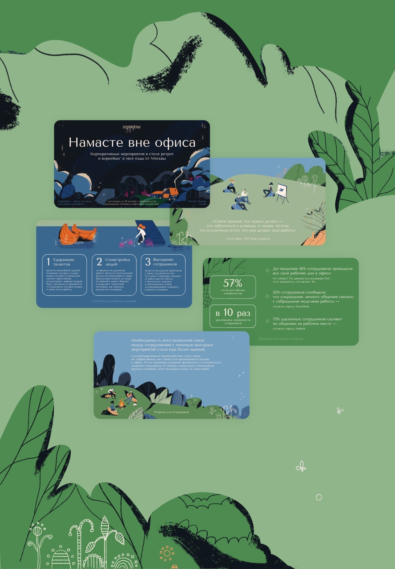 Мы понимаем, что люди в поиске возможностей для ретрита обращают особое внимание на брендинг компании. Он должен вызывать доверие, ощущение спокойствия и уюта.