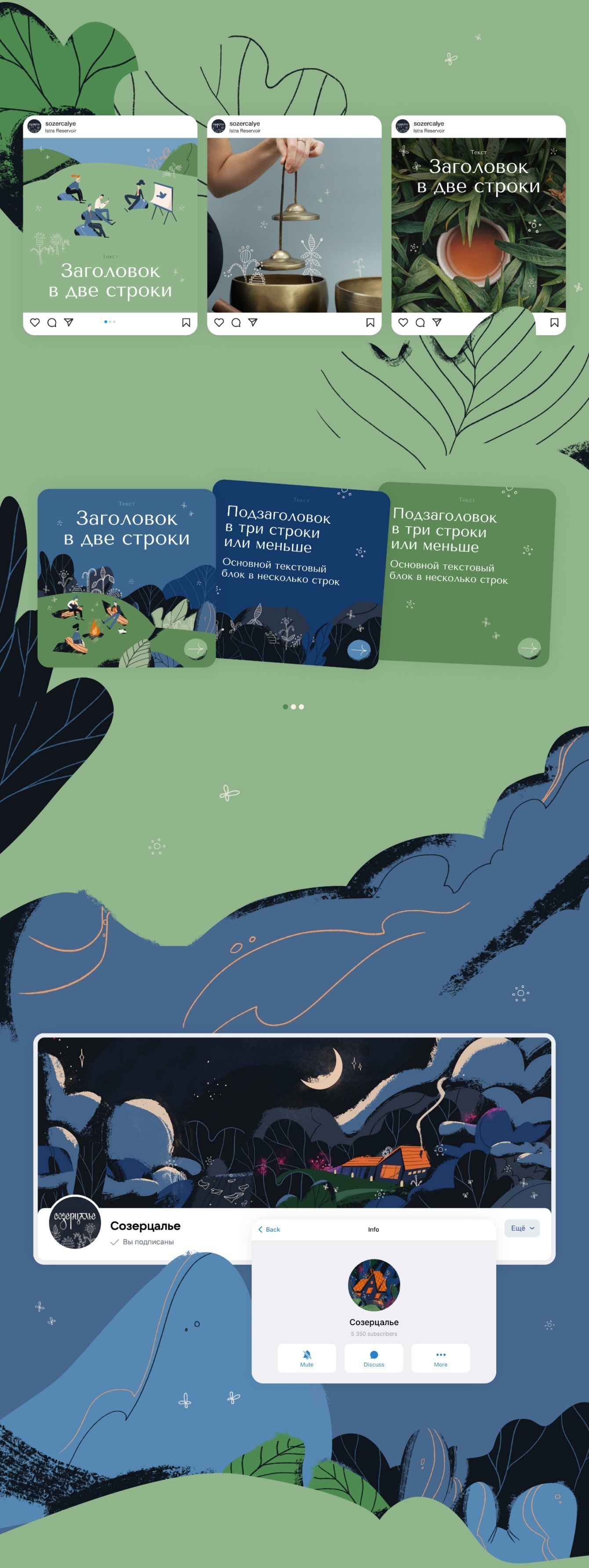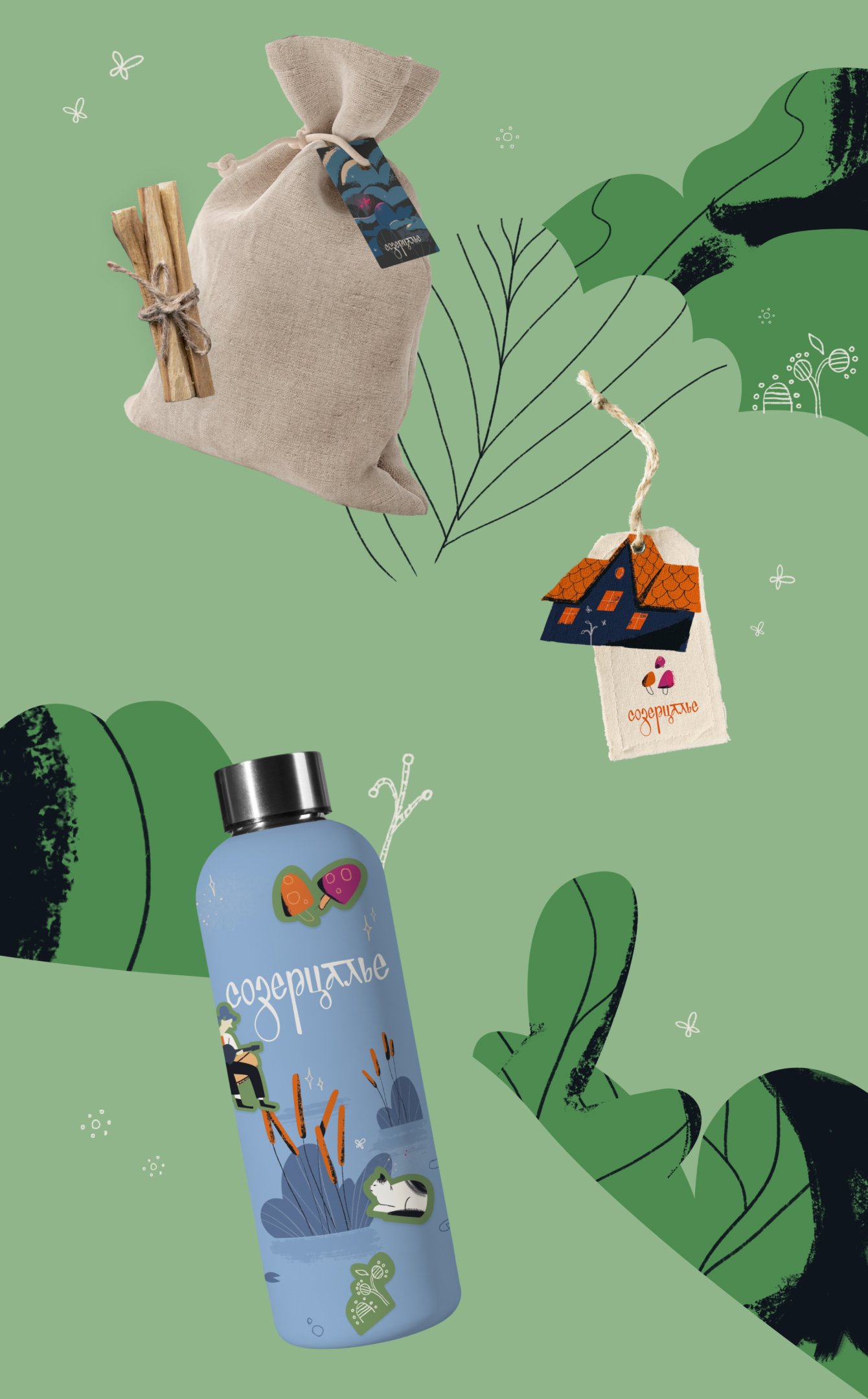 Чувство единства, стремление к развитию и самопознанию — вот ценности «Созерцалья», которые важно было отразить в каждом элементе фирменного стиля. В нашей работе мы передали ощущение особого пространства, скрытого между высокими деревьями и прозрачной рекой.