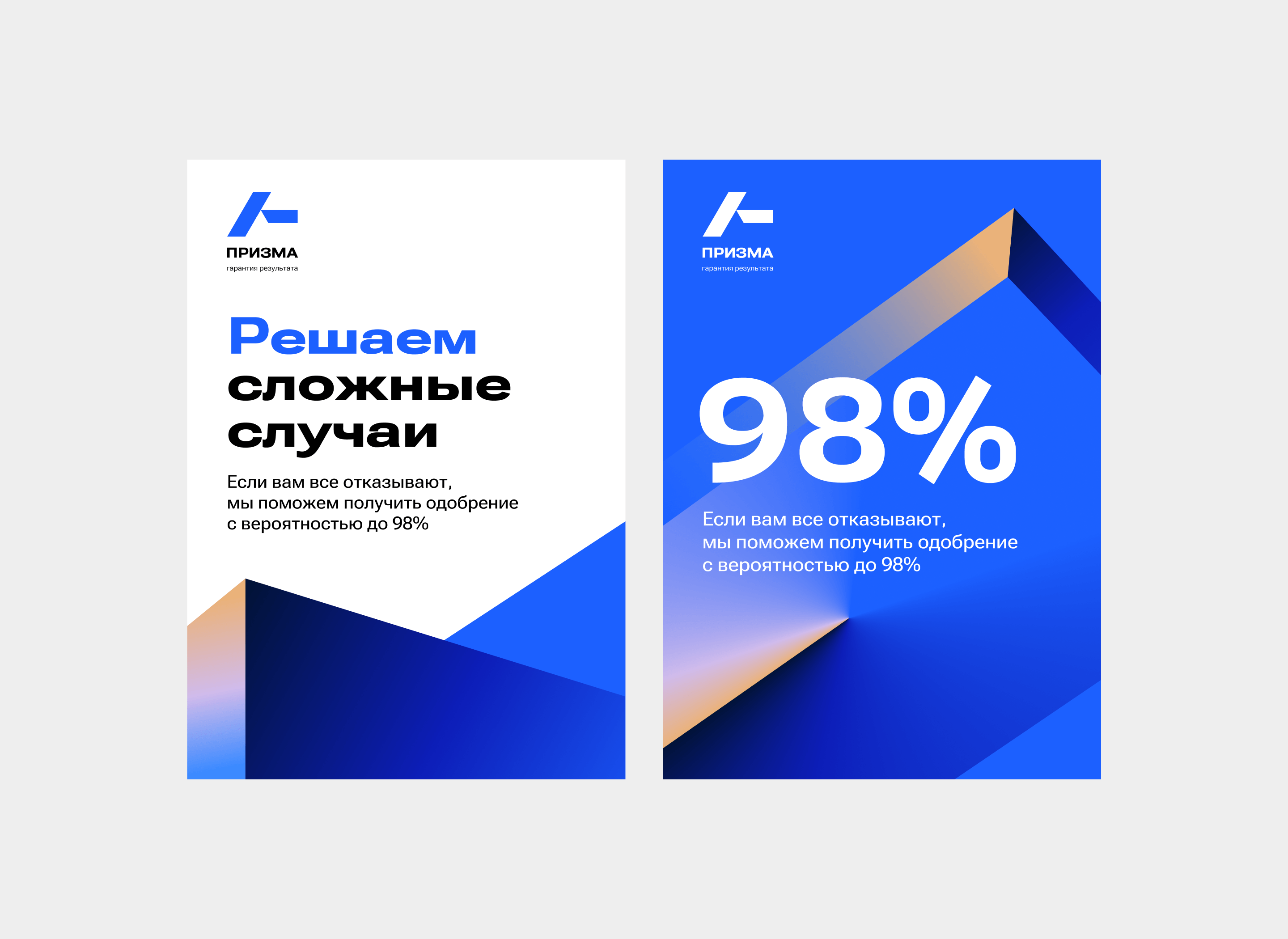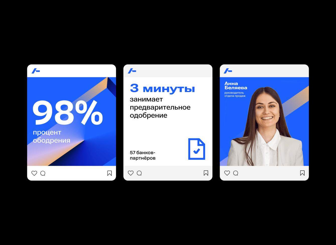 Фирменный стиль получился энергичным и современным. Графика и струящийся градиент подчеркивают 3 принципа работы компании: надёжность, скорость и экспертность. Синий цвет, плотно ассоциирующийся с финансами, хорошо работает в диджитал-среде, создавая узнаваемый образ бренда.