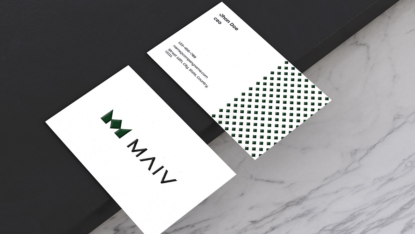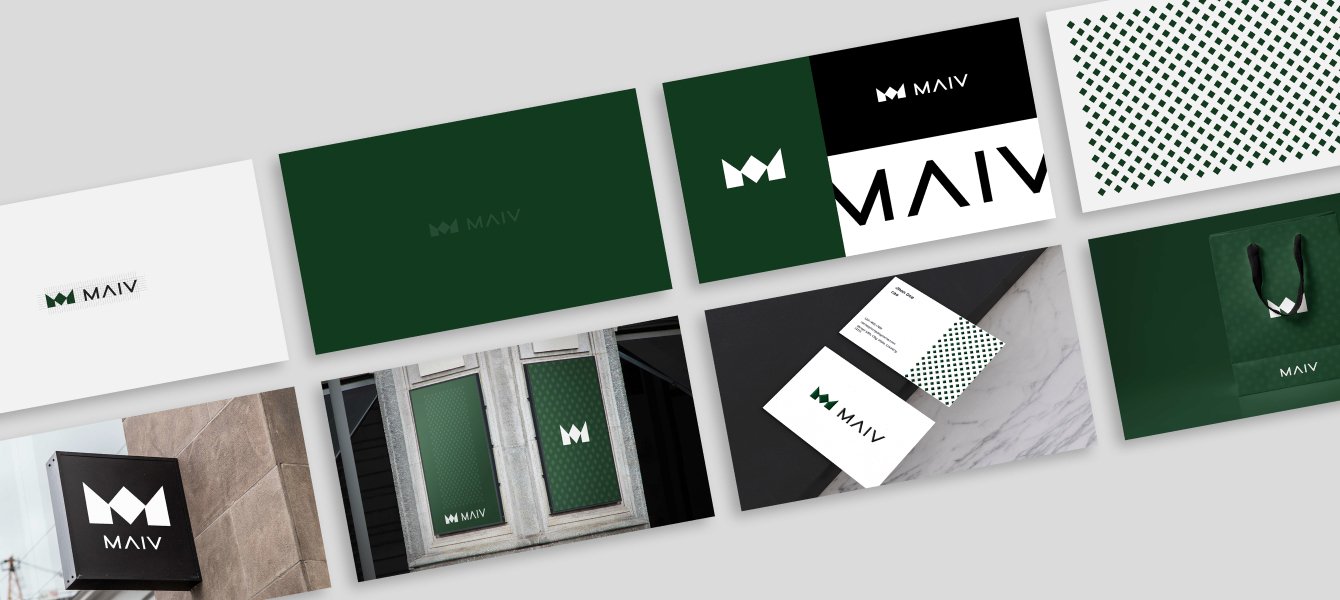 Для брендирования онлайн- и офлайн-носителей мы разработали уникальный паттерн с использованием фирменного темно-зеленого цвета. Основой паттерна стали строгие и элегантные ромбы, которые угадываются в новом логотипе MAIV.