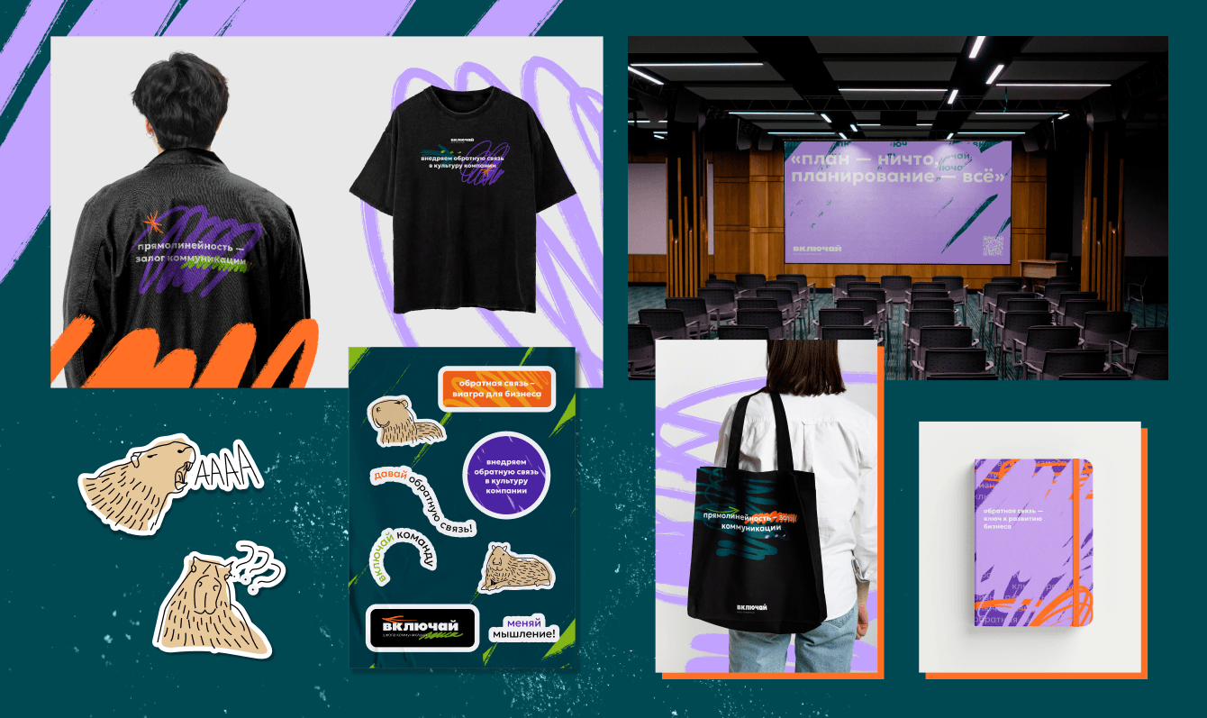 Пересечение массивного шрифта и отрисованных элементов создаёт баланс между устойчивым, монументальным и быстрым, торопящимся характерами, что отсылает к образу внутренней работы бизнеса. Фирменный стиль дополняется насыщенной цветовой палитрой и графическими элементами.