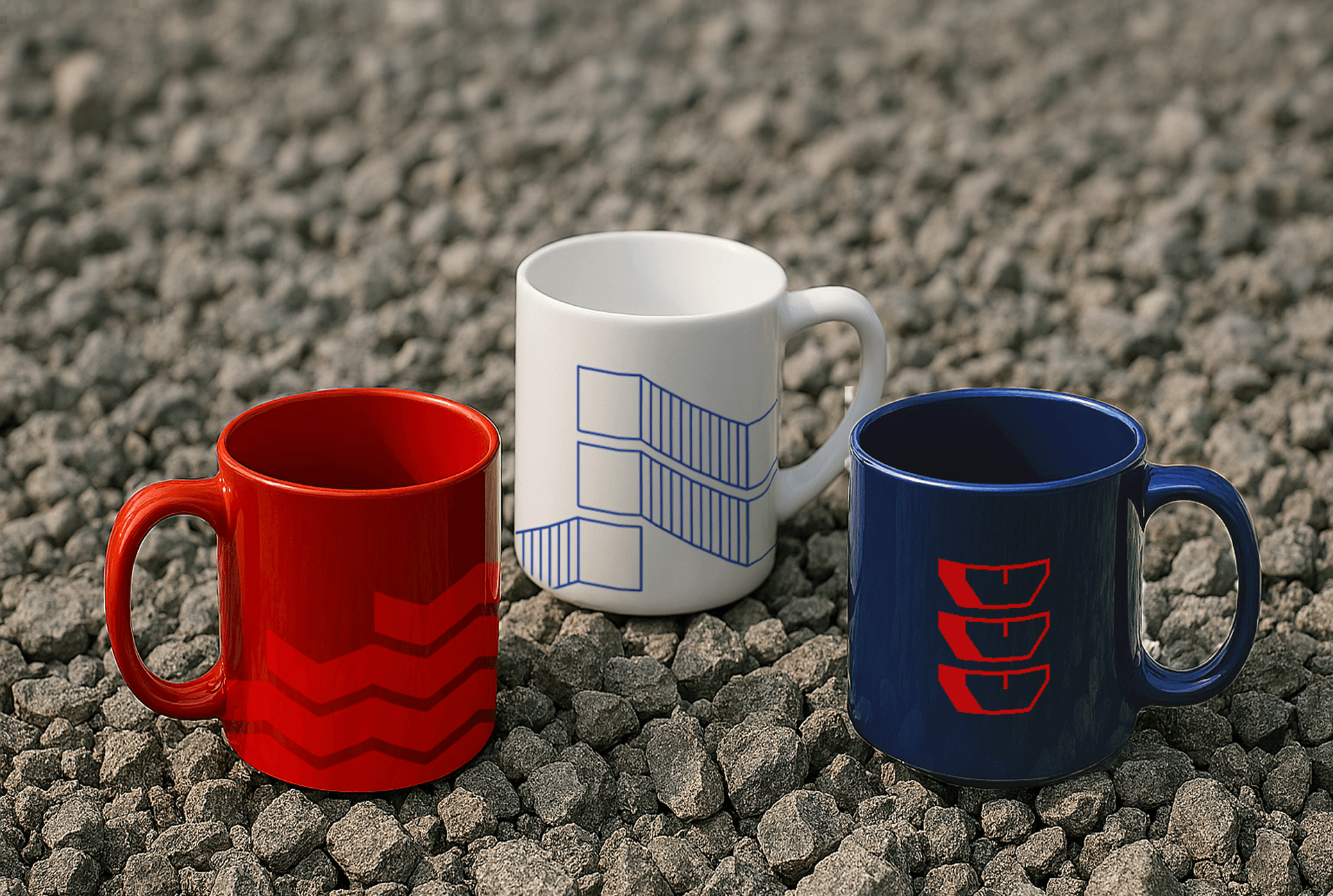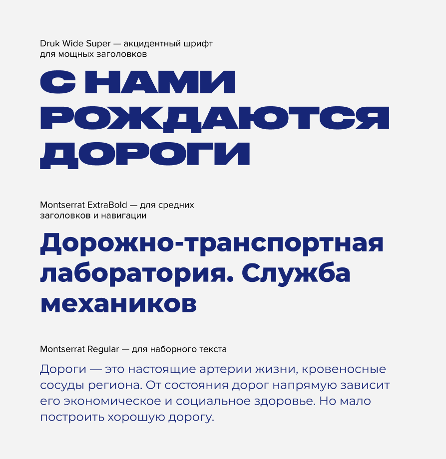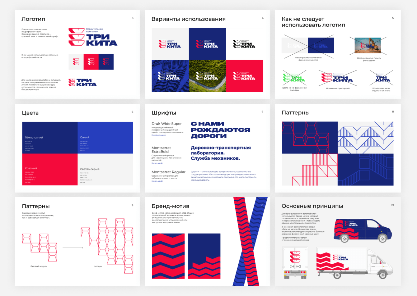 Подобрали цветовую гамму: два оттенка синего, нейтральный серый и громкий красный. Такая гамма содержит нюансные и контрастные сочетания, что важно для оформления разнообразных носителей. А в сочетании с жёлтым цветом строительной техники получается яркое, запоминающееся цветовое решение.