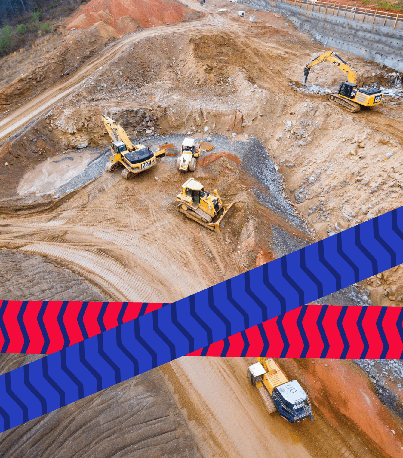 Яркие полосы с рисунком по мотивам отпечатков протекторов строительной техники.
