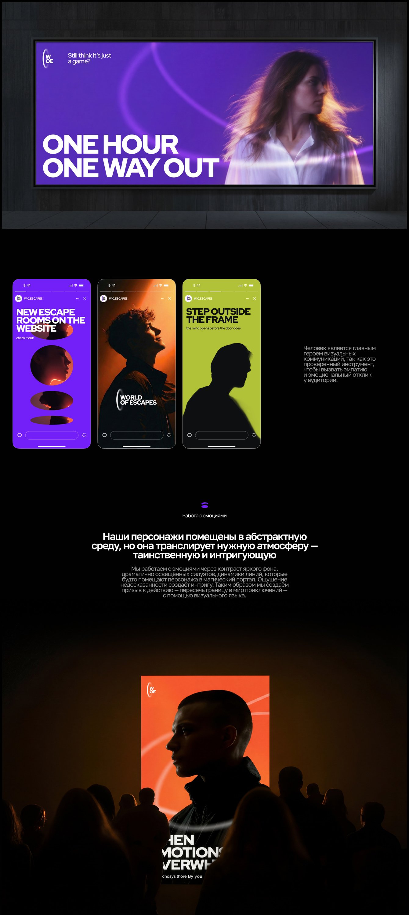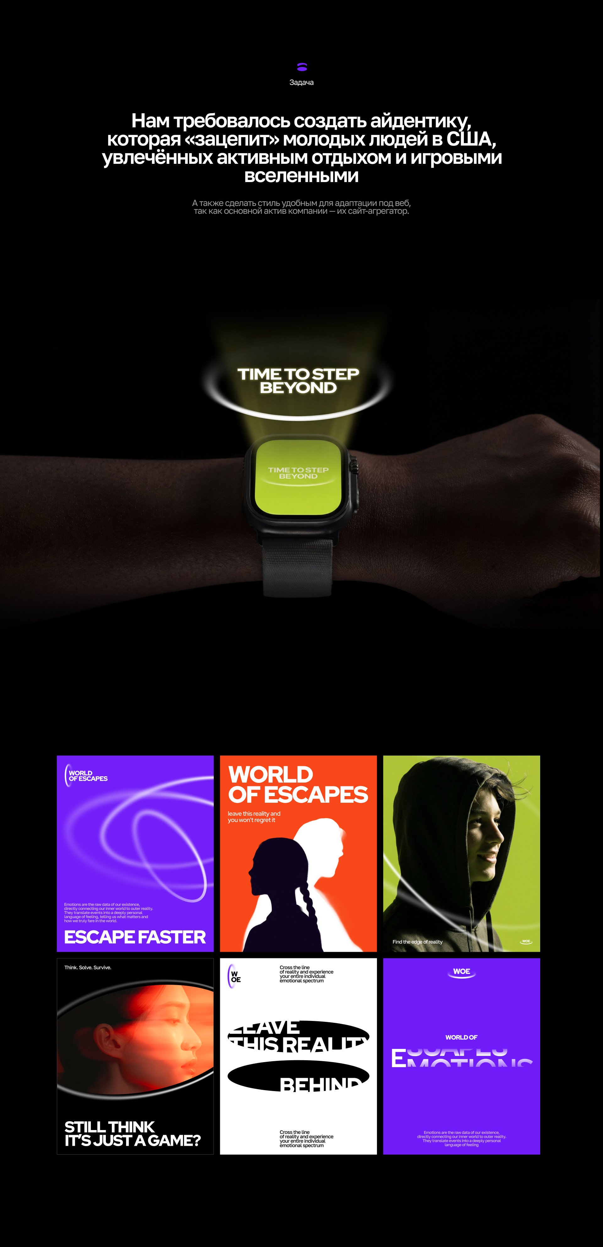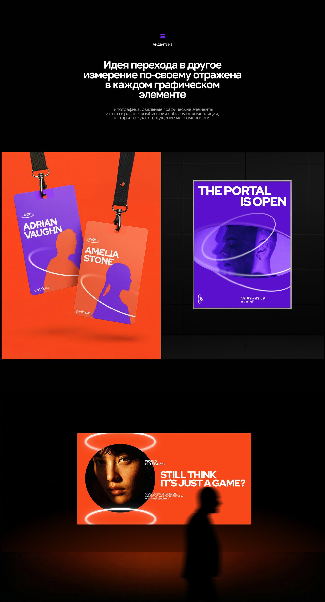 Главная метафора — пересечение границы между реальностью и игрой. Через графику, типографику и композиции мы создаём ощущение глубины и движения, будто пользователь делает шаг в другое измерение. Это усиливает вовлечение и помогает бренду World of Escapes ассоциироваться с исследованием, эмоциями и новым опытом.