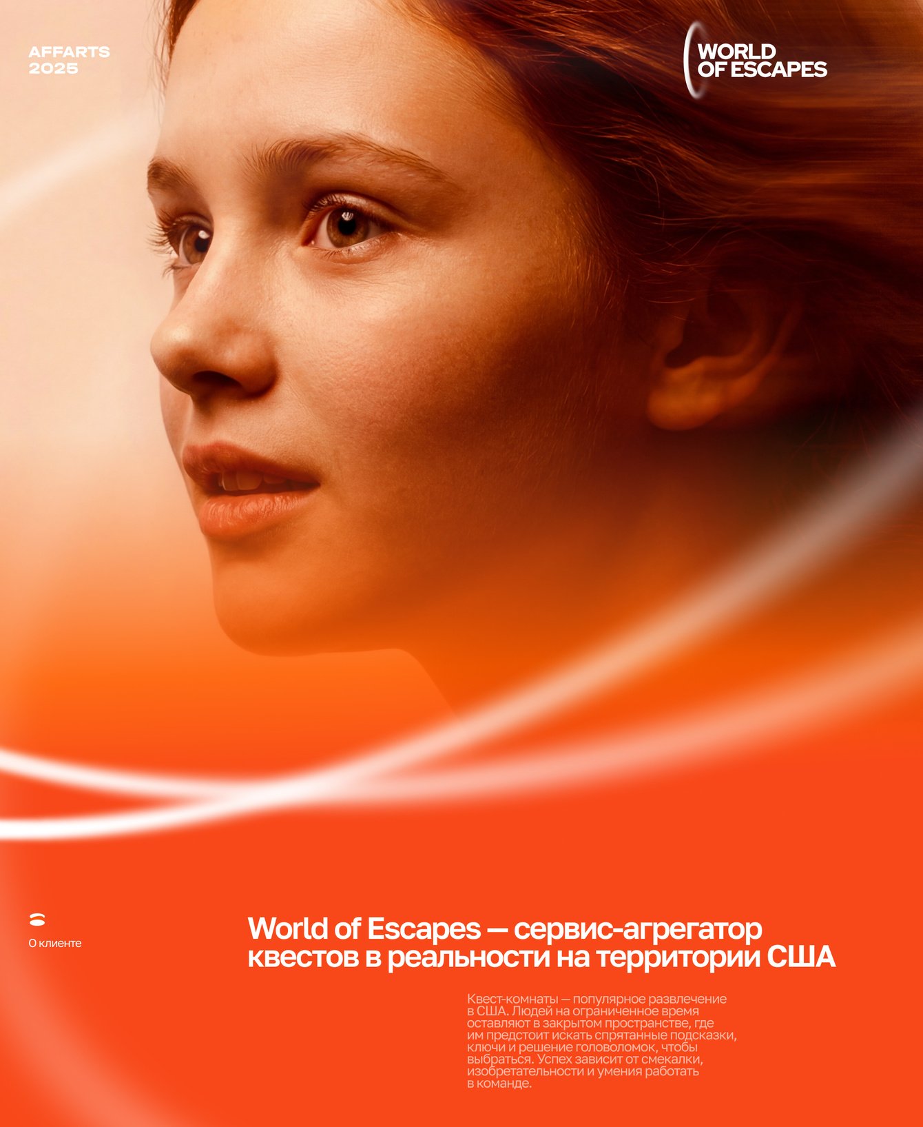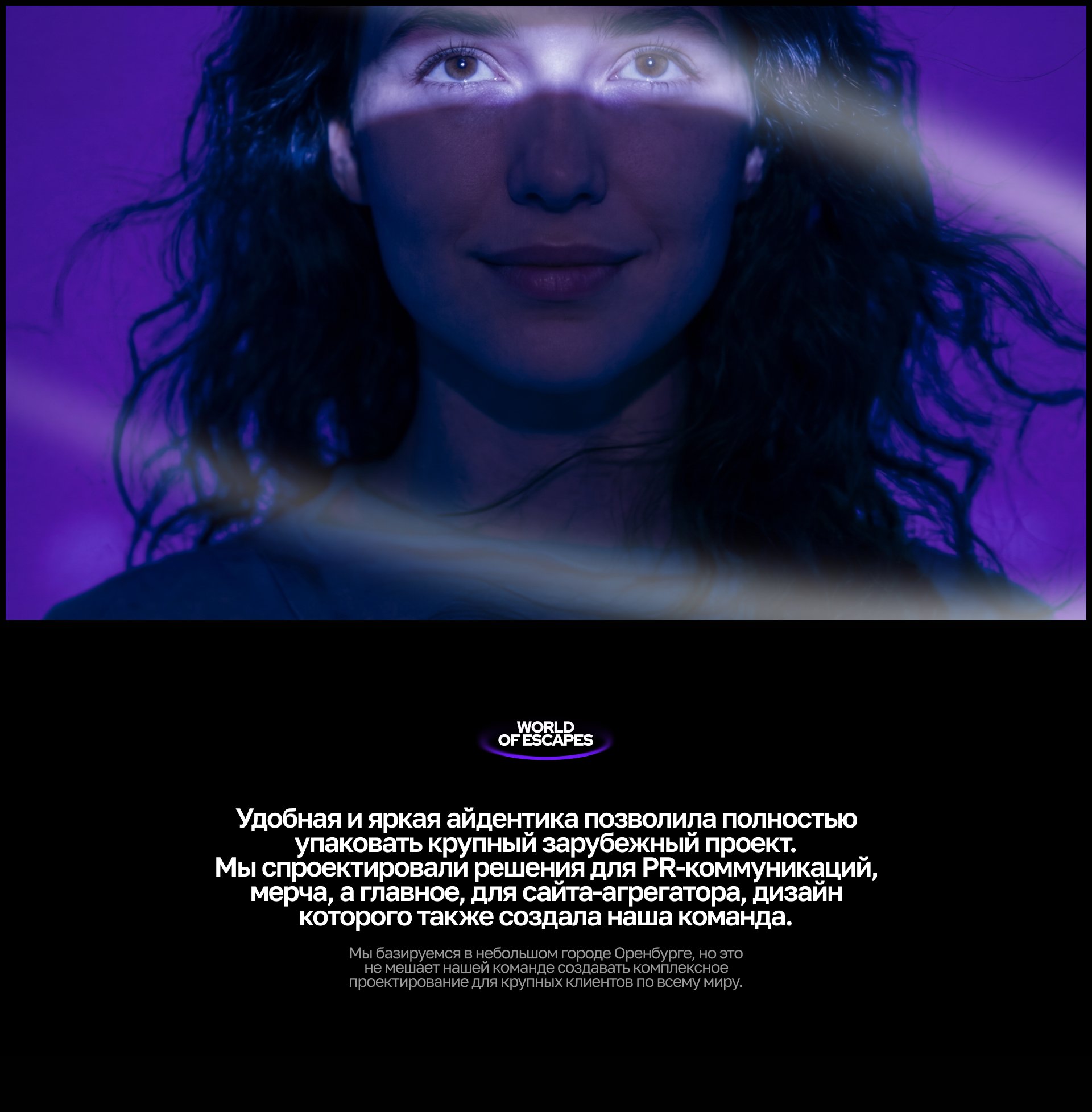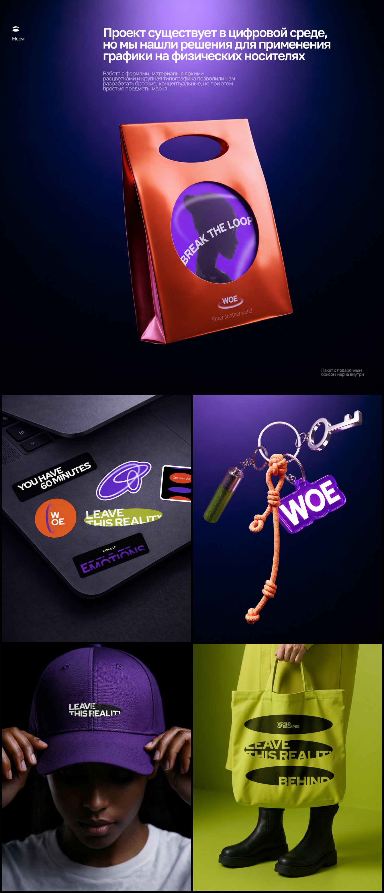Главная метафора — пересечение границы между реальностью и игрой. Через графику, типографику и композиции мы создаём ощущение глубины и движения, будто пользователь делает шаг в другое измерение. Это усиливает вовлечение и помогает бренду World of Escapes ассоциироваться с исследованием, эмоциями и новым опытом.