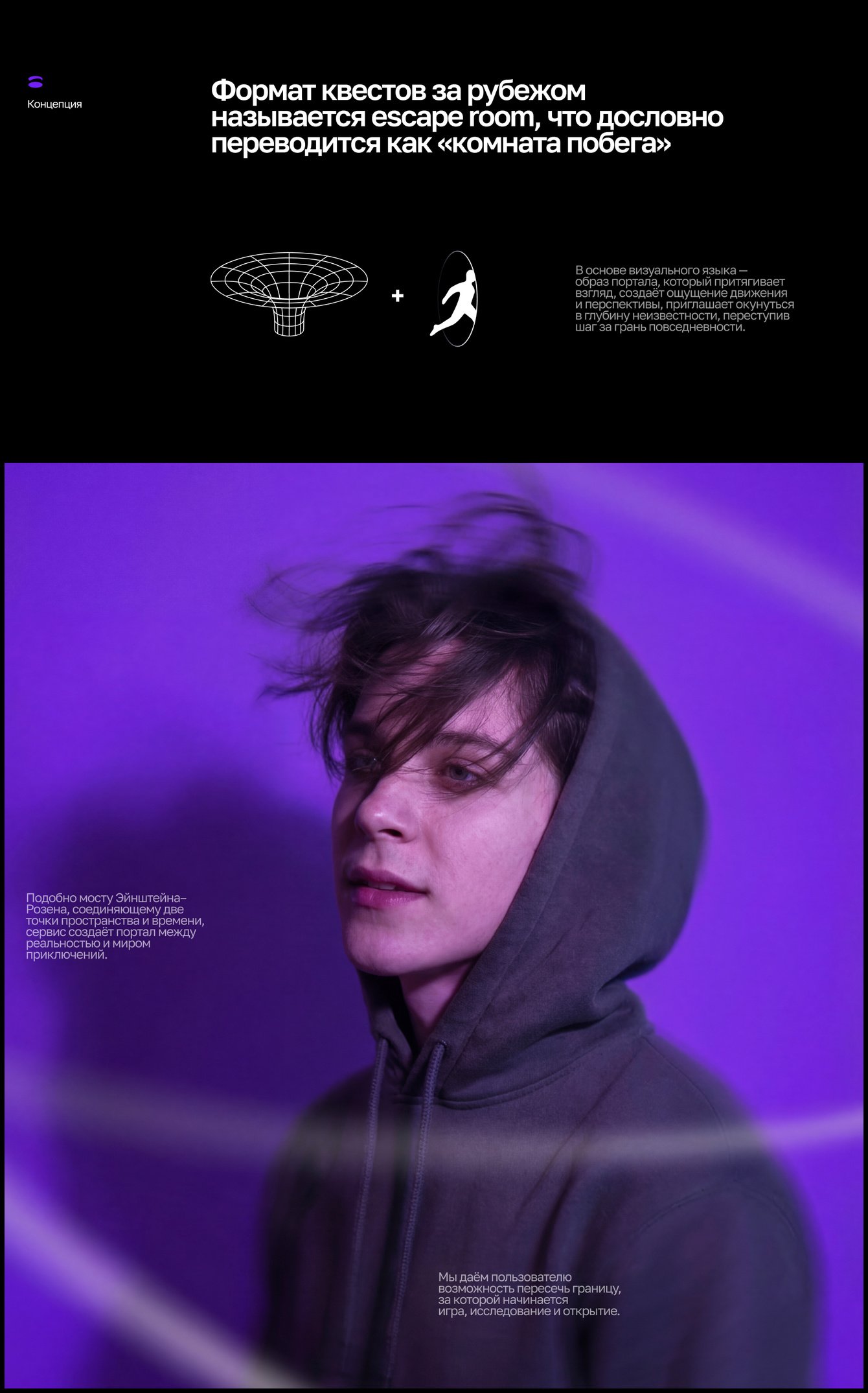 Очень точное попадание в суть продукта через метафору. Идея «портала» как перехода из реальности в игру — сильная и понятная, она сразу задаёт эмоциональный тон и делает бренд не просто агрегатором, а точкой входа в опыт. Мы передали не список квестов, а ощущение приключения.