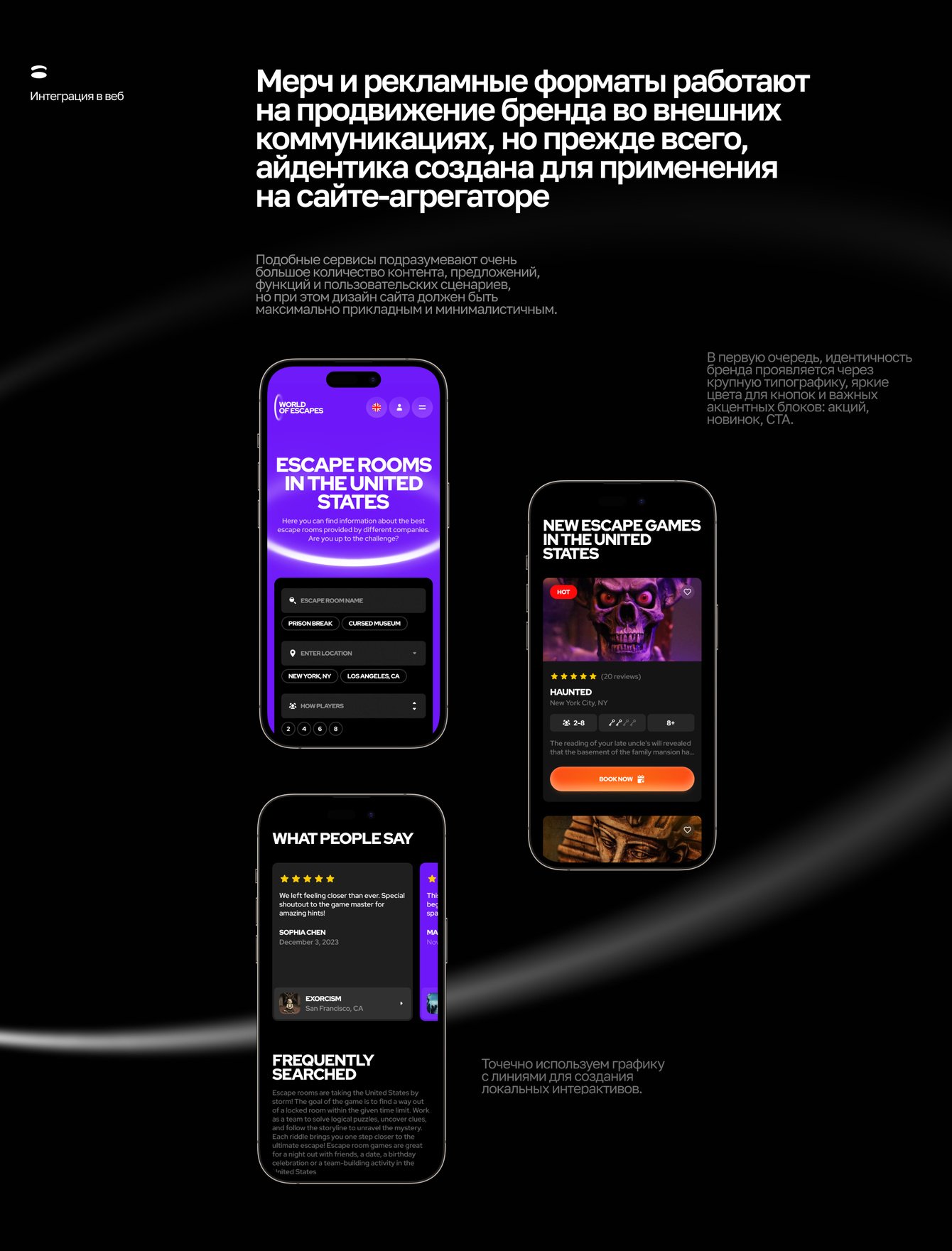 Нам требовалось разработать айдентику для World of Escapes, способную привлечь молодых людей в США, которые интересуются активным отдыхом и игровыми вселенными. Главная задача — сделать фирстиль удобным для адаптации под веб, так как основной актив компании — их сайт-агрегатор.