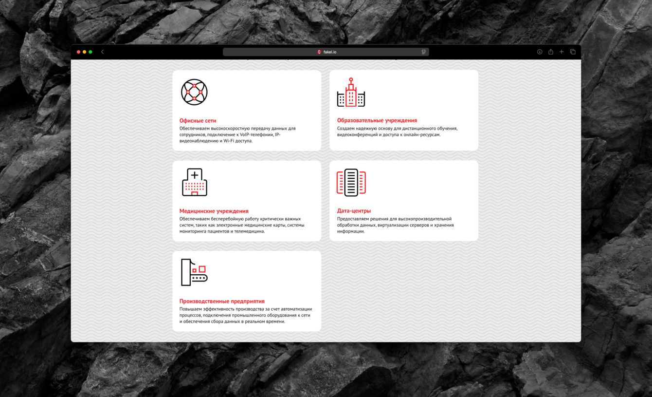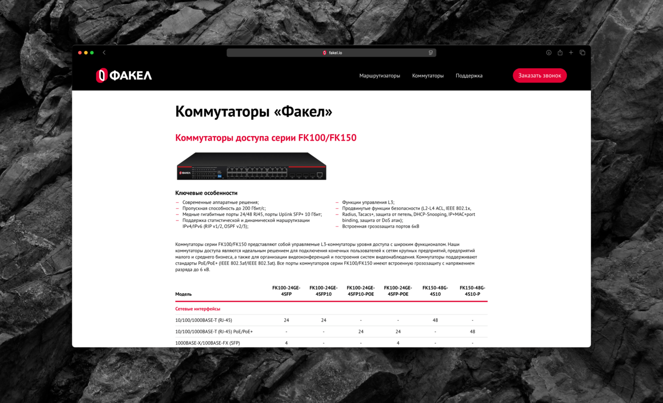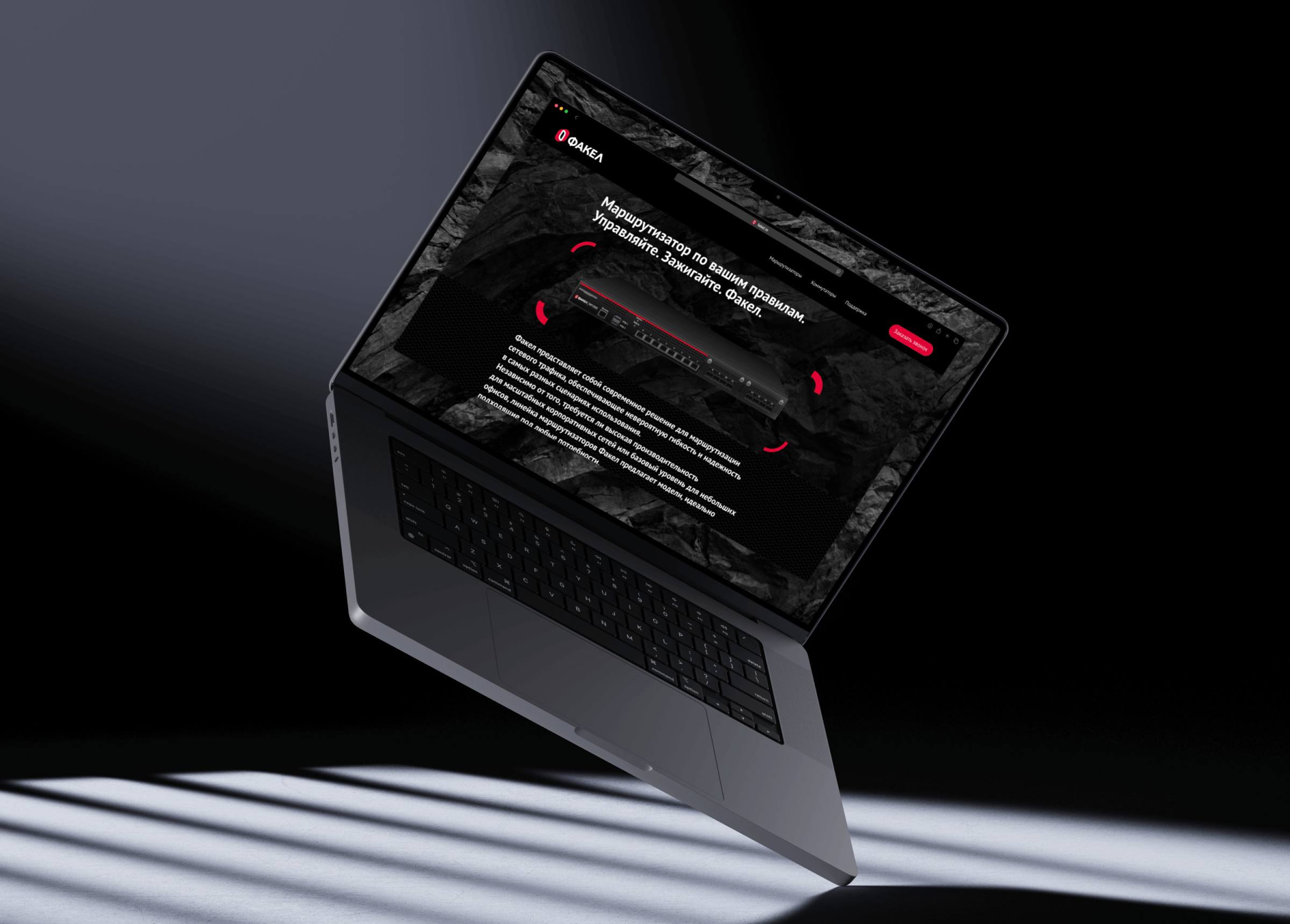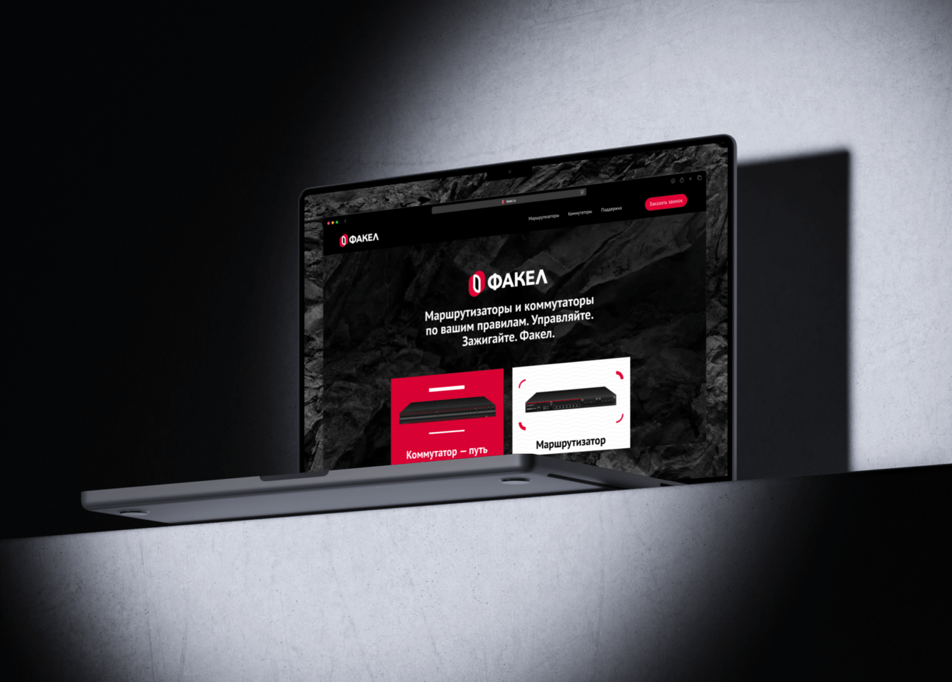 Компания «ИТ Роут» занимается изготовлением маршрутизаторов и коммутаторов «Факел». Мы сделали айдентику и сайт для линейки продукции.