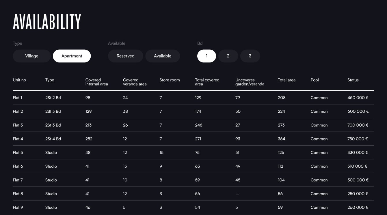 5. Блок Availability отражает актуальную информацию о наличии и характеристиках свободных апартаментов и таунхаусов. Фильтры по параметрам упрощают подбор.