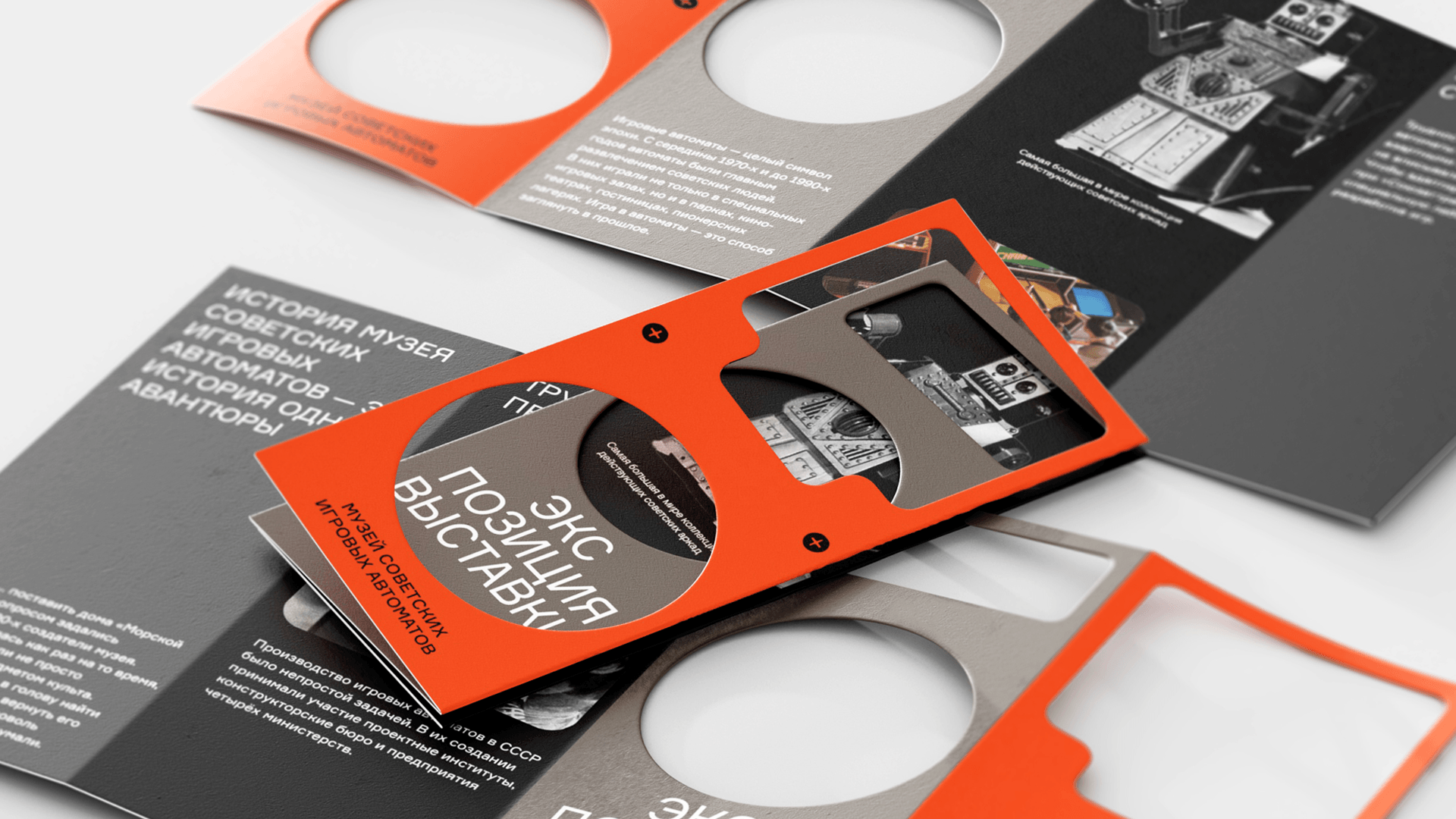 В основе айдентики лежит метафора игрового автомата как составного устройства. Этот принцип перенесён в графику: каждый макет строится из отдельных слоёв — типографики, графических элементов, фотографий и иллюстраций деталей автоматов. Такой подход позволяет создавать как лаконичные, так и насыщенные композиции, сохраняя при этом узнаваемость.
