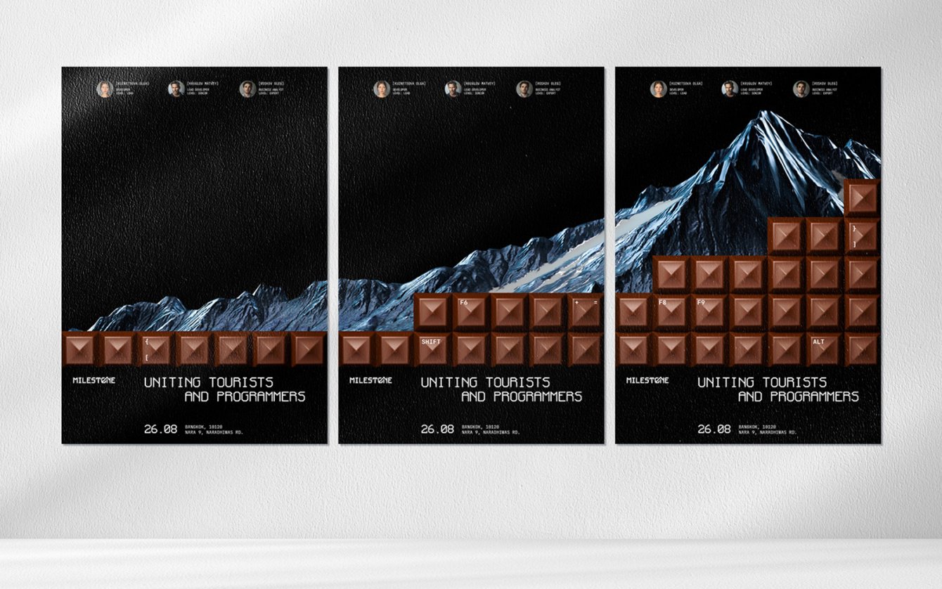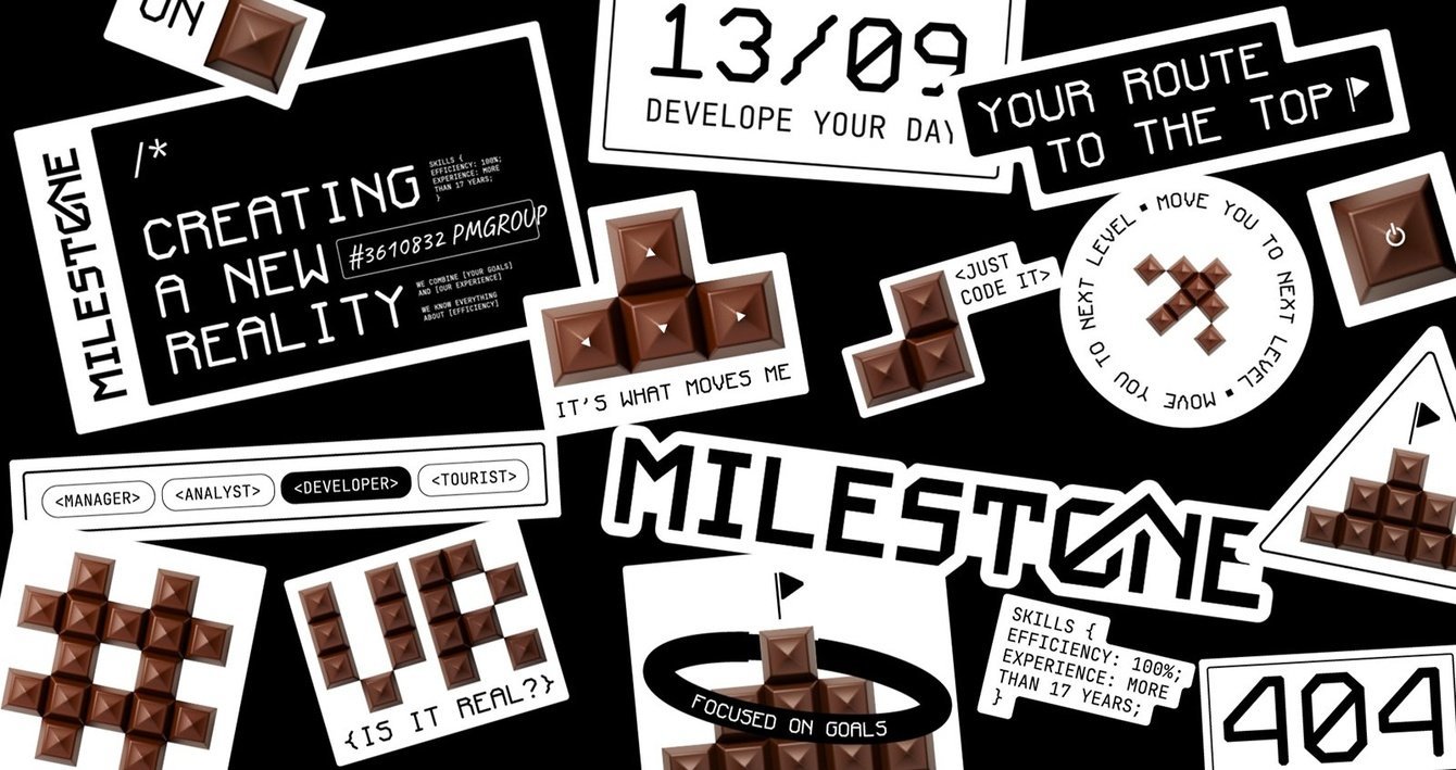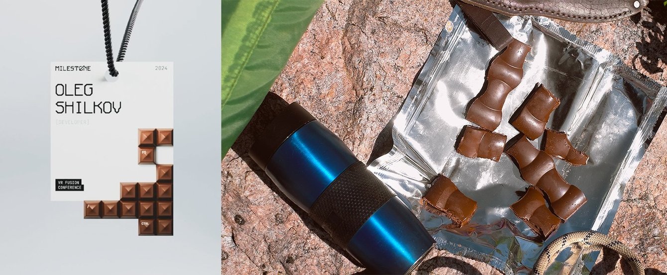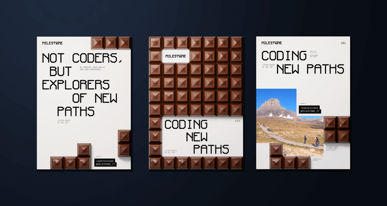 При достижении определенной точки на маршруте происходит деление шоколадки между всеми членами группы. Через образ перевальной шоколадки в айдентике мы показываем, что команда Milestone не просто разрабатывает приложения по заказу, а проходит каждый этап разработки проекта вместе с командой клиента, подобно туристической группе. Двигаемся вверх к вершине шаг за шагом, кусочек за кусочком.