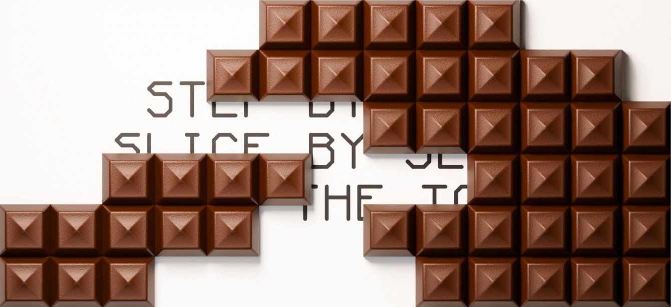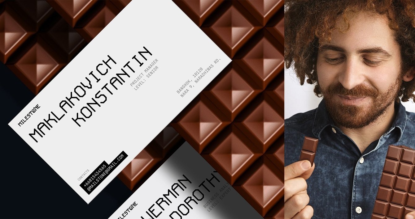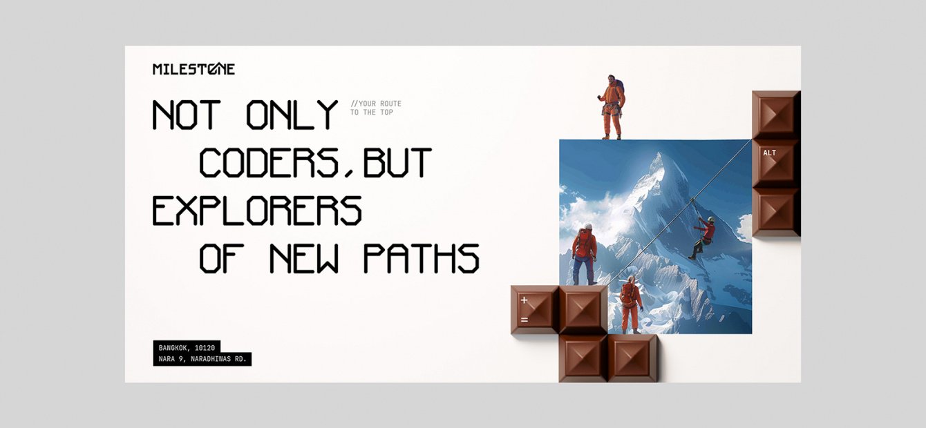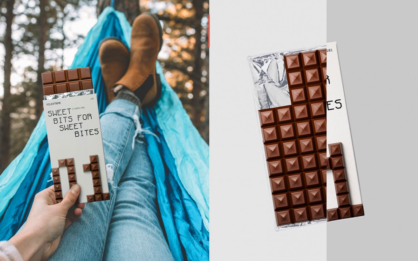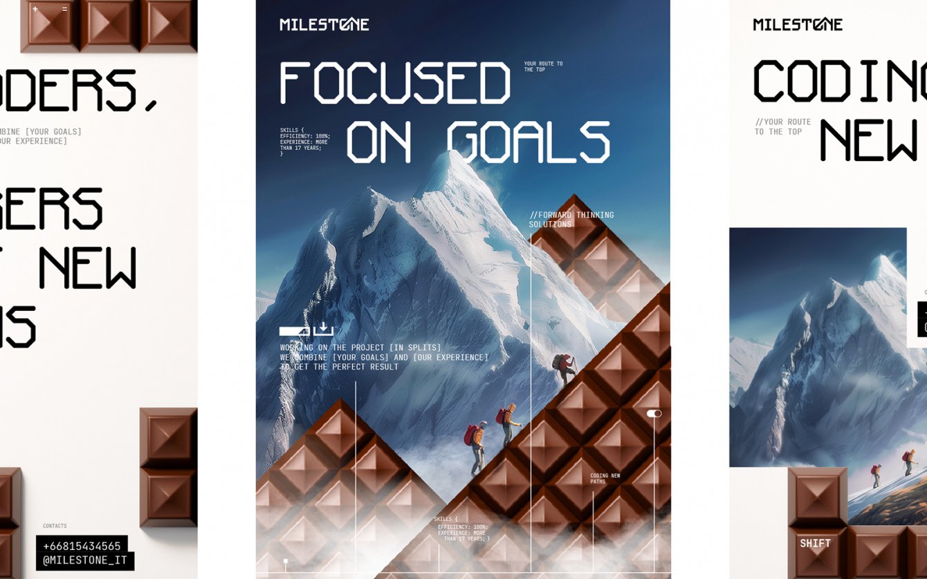 При достижении определенной точки на маршруте происходит деление шоколадки между всеми членами группы. Через образ перевальной шоколадки в айдентике мы показываем, что команда Milestone не просто разрабатывает приложения по заказу, а проходит каждый этап разработки проекта вместе с командой клиента, подобно туристической группе. Двигаемся вверх к вершине шаг за шагом, кусочек за кусочком.