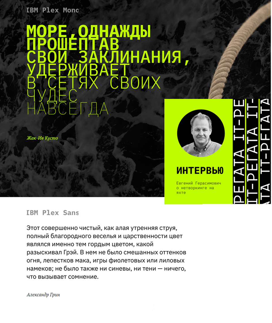 Моноширинный шрифт IBM Plex Mono подчеркивает профессиональную принадлежность в акциденции, а IBM Plex Sans — в обычном наборе.