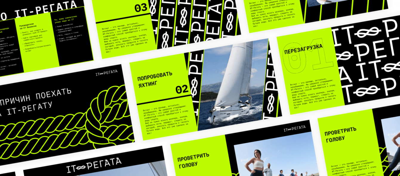 Для нестандартного ивента — международной регаты русскоязычных фаундеров IT-компаний — дизайнеры Doubletapp разработали фирменный стиль и полностью пересобрали сайт мероприятия. Ранее организаторы уделяли внимание визуальной составляющей по остаточному принципу, но на четвертом году существования ивента они поняли, что продажи туров на регату существенно зависят от качества сайта и оформления ивента. Чтобы продолжать расти и повышать продажи, нужно демонстрировать статус мероприятия на всех уровнях.