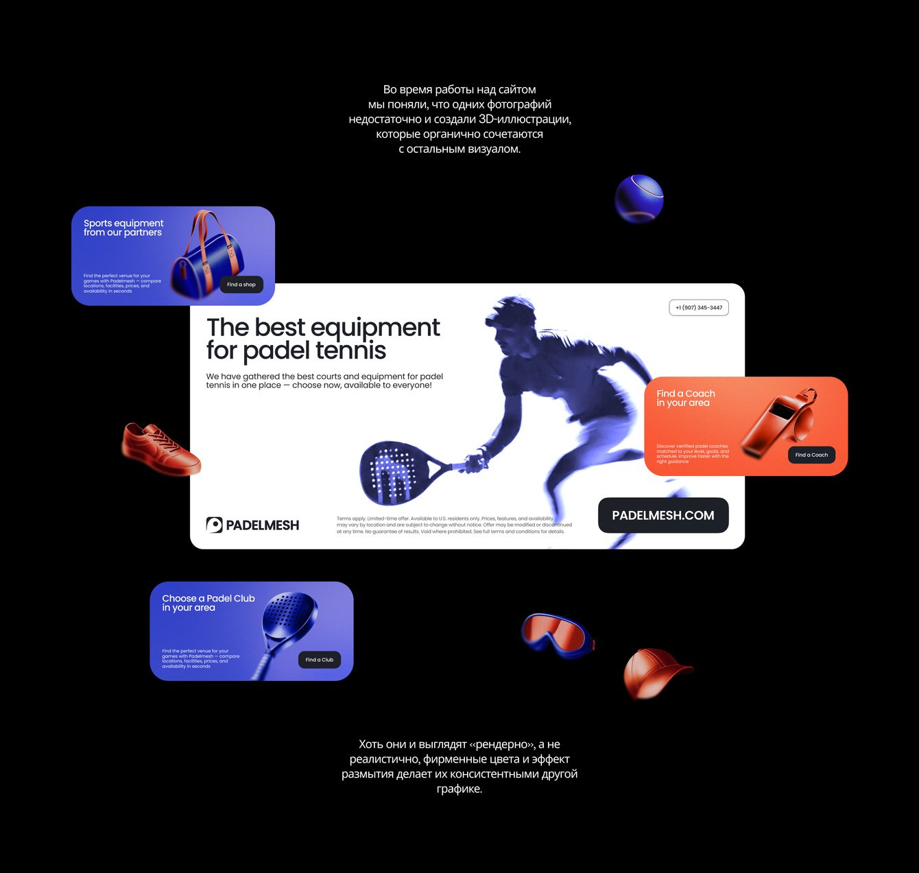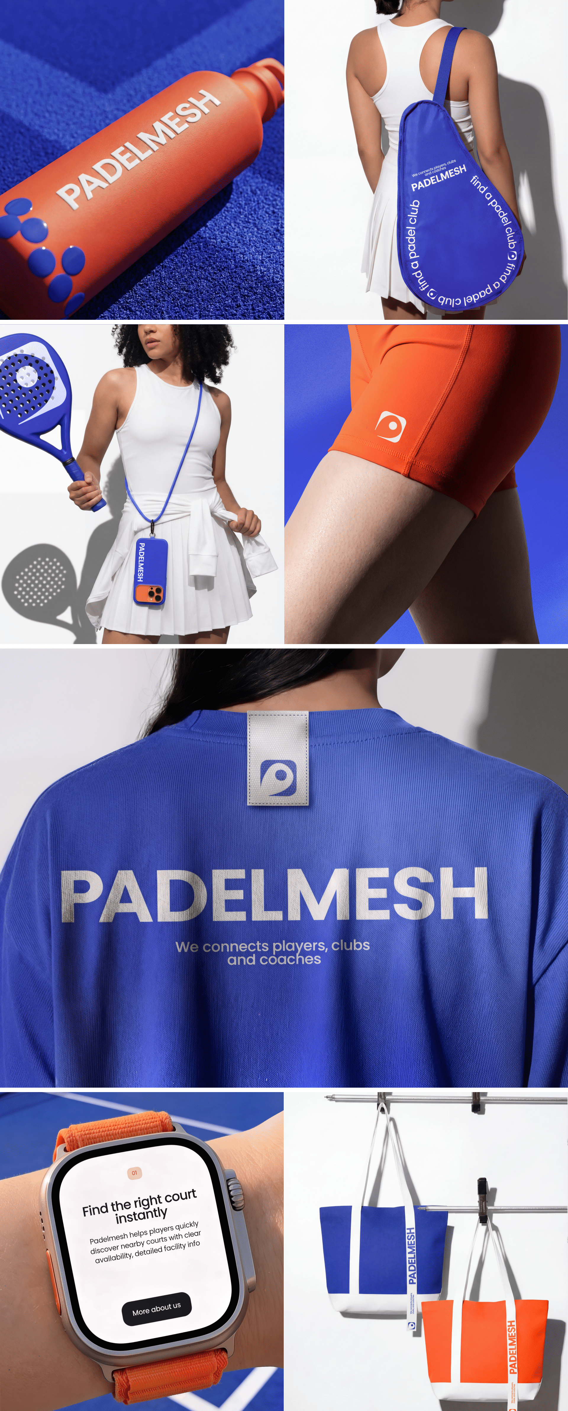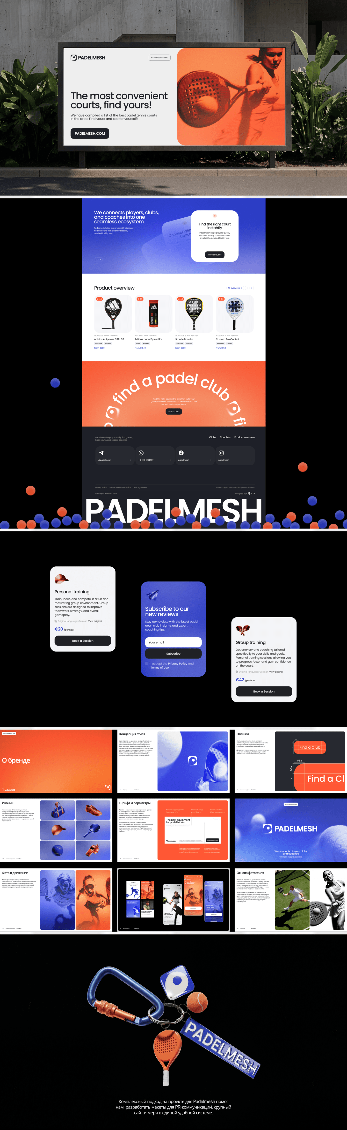 В первую очередь, проект и материалы для его продвижения существуют в цифровой среде. Тем не менее продукт продаёт физические услуги — аренду кортов и занятия с тренерами. Поэтому мы разработали линейку спортивных аксессуаров для спортсменов и тренеров, которые будут партнёрами и амбассадорами PadelMesh.