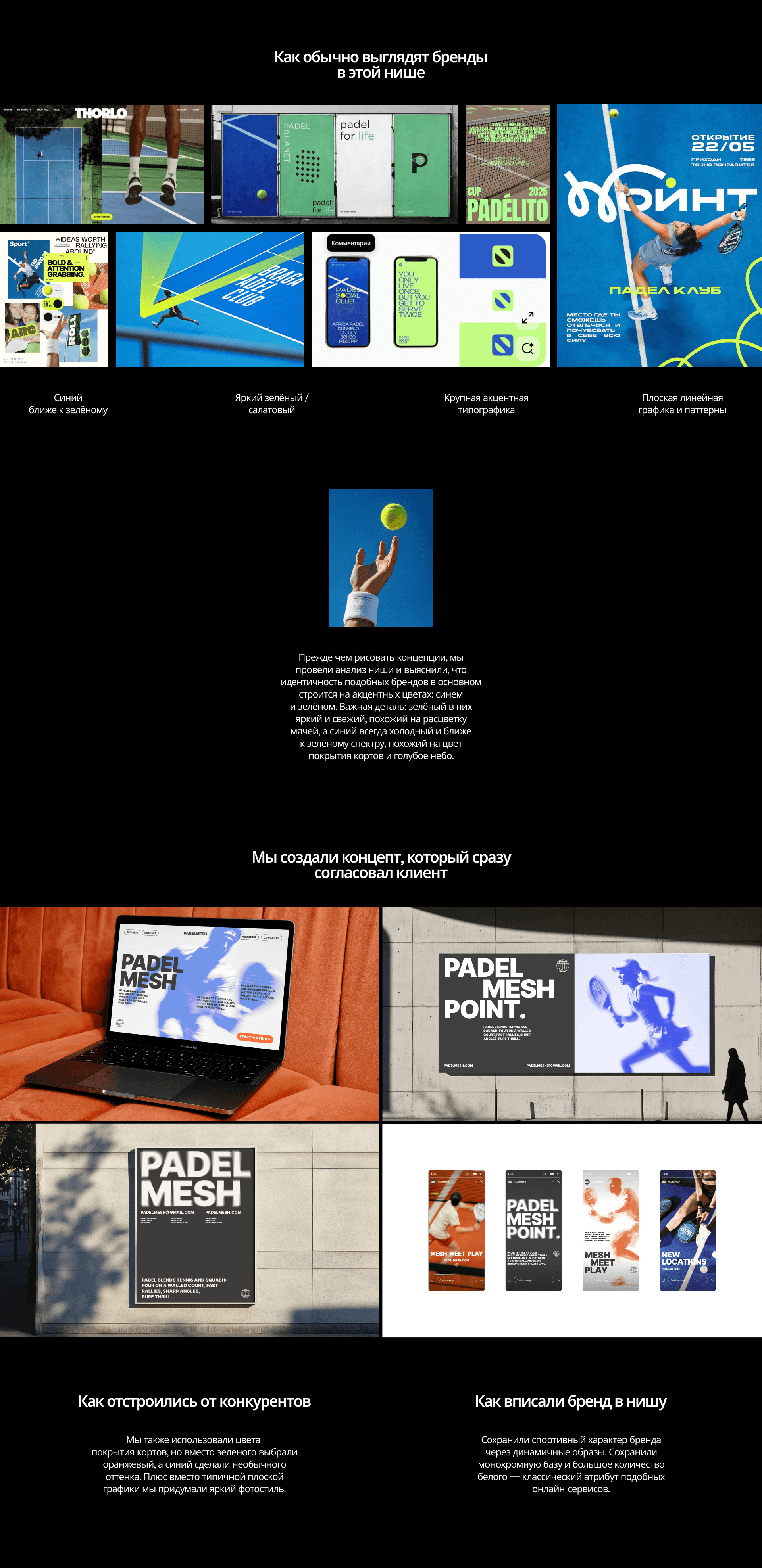 Главная проблема: если допустить перекос в сторону «спортивности», бренд будет ассоциироваться именно с падел-клубом, школой и другими спортивными проектами в офлайне. А если увести стиль в «диджитальность», то потеряется связь с ценностным предложением компании — возможностью найти и забронировать корт на агрегаторе.