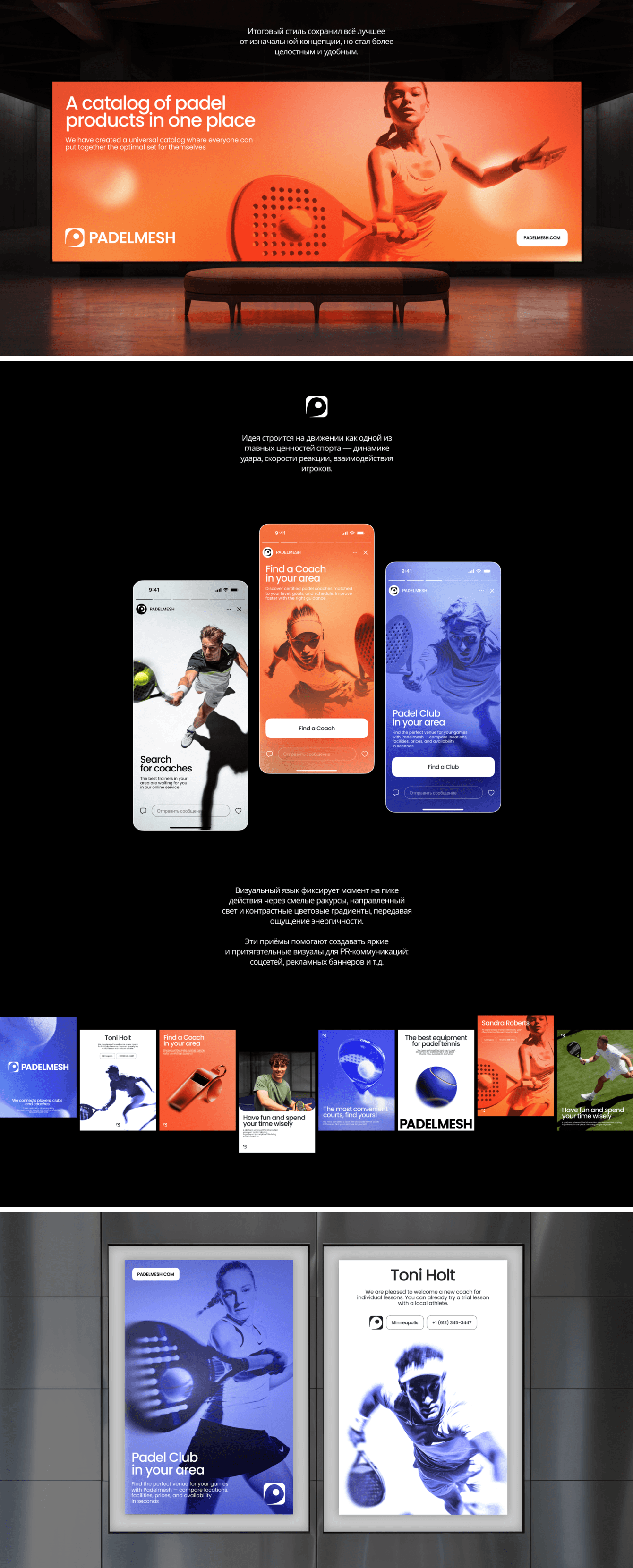 Проект PadelMesh находится на стыке двух сфер — онлайн-сервисов и спорта. Нам важно было найти баланс между ними и сделать так, чтобы айдентика легко ложилась на цифровые площадки — в первую очередь сайт.