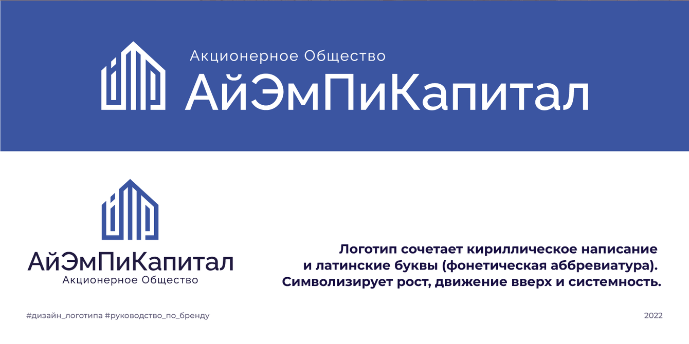 Логотип сочетает кириллическое написание и латинские буквы (фонетическая аббревиатура). Символизирует рост, движение вверх и системность.