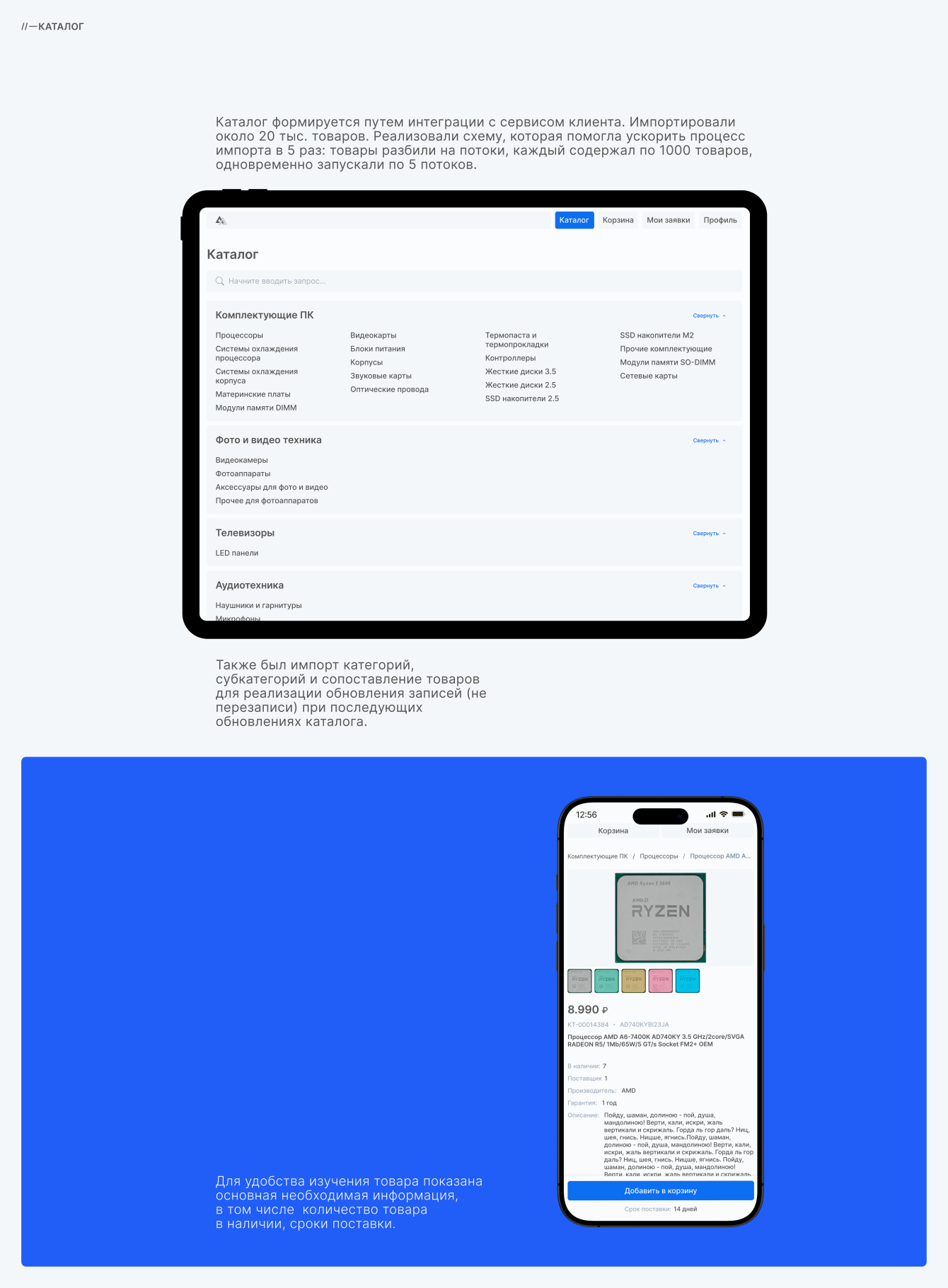 Каталог на сайте формировался путем интеграции с сервисом клиента. Импортировали около 20 тыс. товаров. Реализовали схему, которая помогла ускорить процесс импорта в 5 раз: товары разбили на потоки и запускали их одновременно.