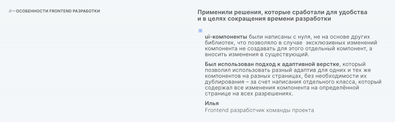 – был использован подход к адаптивной верстке, который позволил применять разный адаптив для одних и тех же компонентов на разных страницах, без необходимости их дублирования.