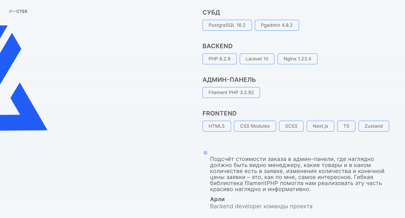 Применили решения, которые сработали для удобства и в целях сокращения времени разработки: