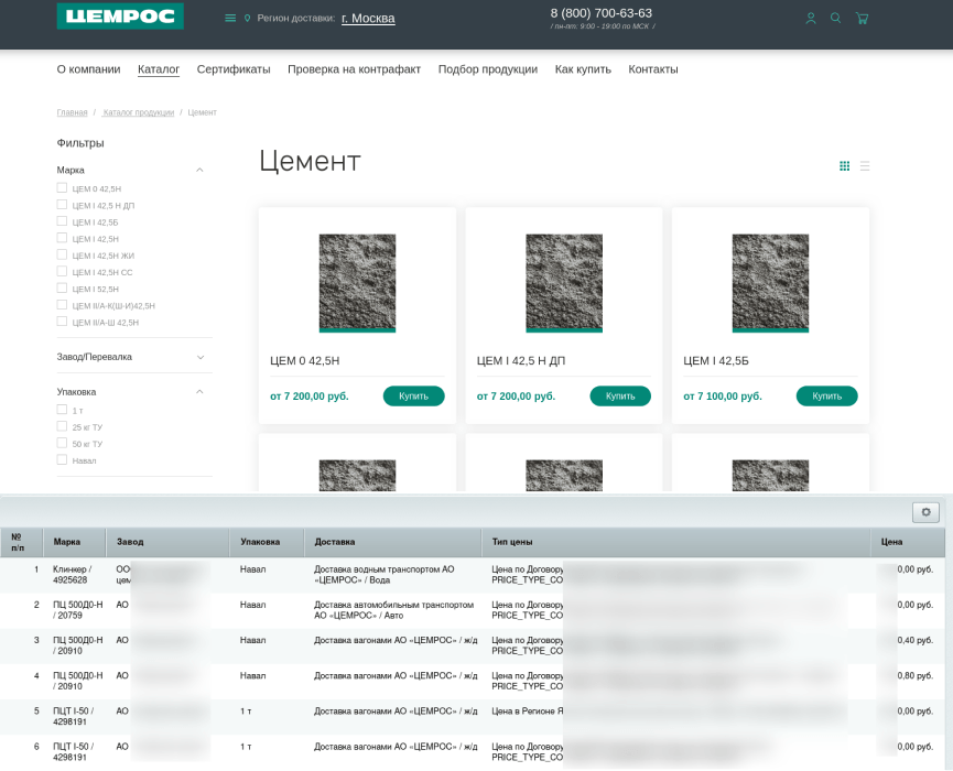 Хотя сайт и называют интернет-магазином, это по сути — «Личный кабинет». То есть «автоматизированное рабочее место» закупщика строительных материалов (цемента) от компаний-клиентов ЦЕМРОС. Основная масса данных на проекте передается из ERP-компании через HTTP-запросы с XML-представлением данных.