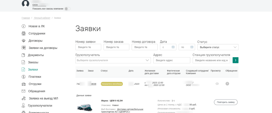 В «личном кабинете» пользователь может управлять своими компаниями, грузополучателями, адресами доставок, заявками на типовые договоры и прочей информацией, необходимой для работы. Здесь же хранится информация по заказам и платежам.