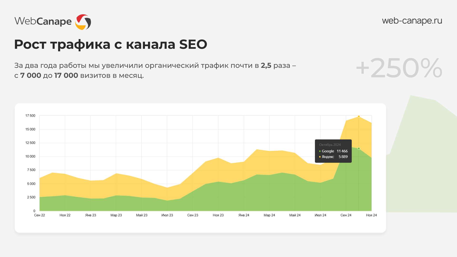 - За два года работы увеличили органический трафик в 2,4 раза — с 7 000 до 17 000 визитов в месяц.