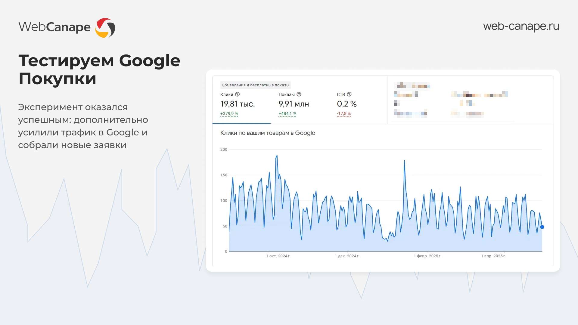 В качестве дополнительного канала продвижения наши специалисты решили попробовать инструмент Google Покупки. И этот сервис отлично себя показал. Трафик с него вырос в 13 раз.