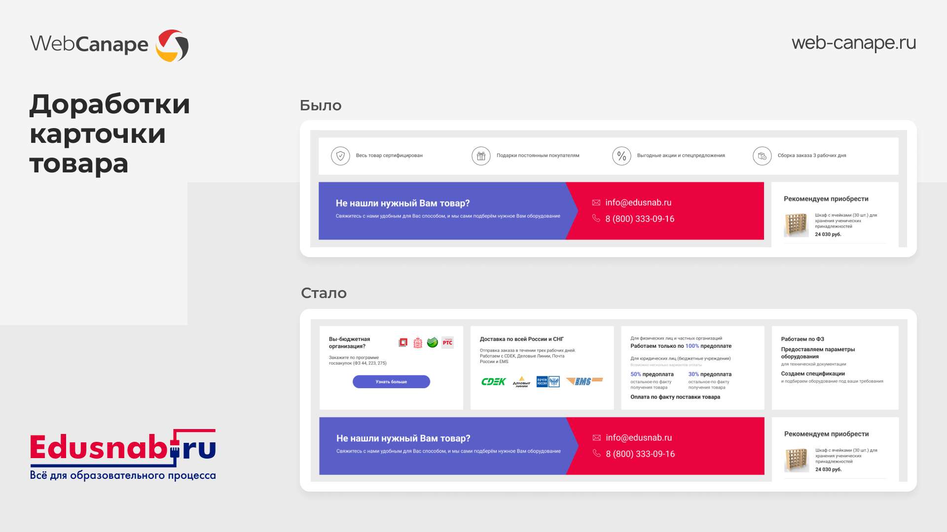 Добавили в карточки «конверсионные блоки» — дополнительные поля с полезной для потенциального покупателя информацией. Теперь все нужное собрано в одном месте: информация о госзакупках, сведения об оплате и доставке, дополнительная форма заказа — если необходимую позицию не удалось найти сразу.