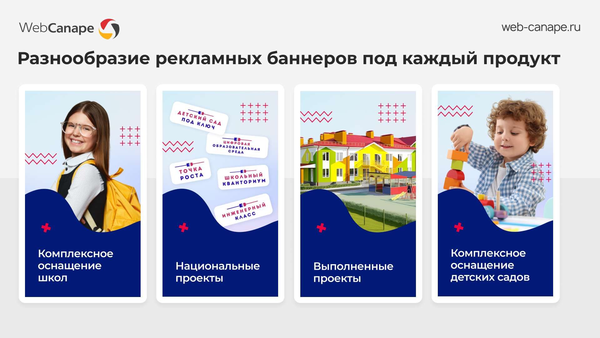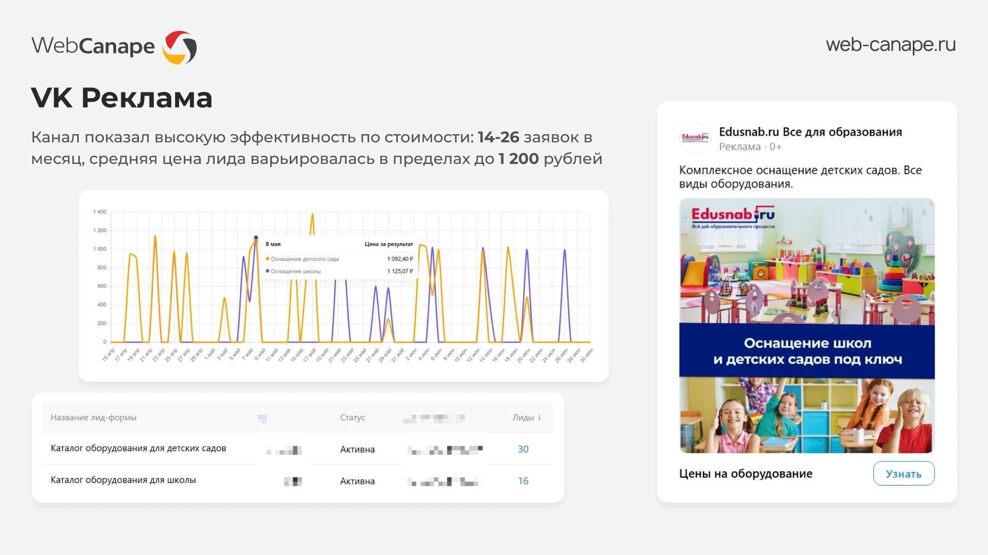 Основной задачей от клиента был все также стабильный поток заявок, но уже на конкретные продукты, например полное оснащение школьного кабинета или даже целого детского сада. Их главная особенность — высокая закупочная стоимость.