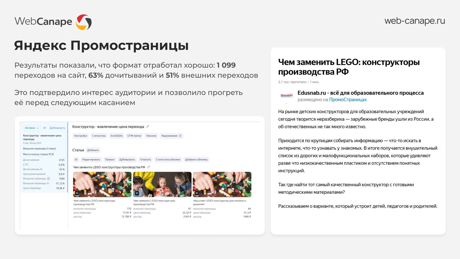 Формат показал хорошие результаты: 1 099 переходов на сайт, 63% дочитываний, 51% внешних переходов и 1:20 мин — среднее время на странице. Это подтвердило интерес аудитории и позволило прогреть ее перед последующим касанием.