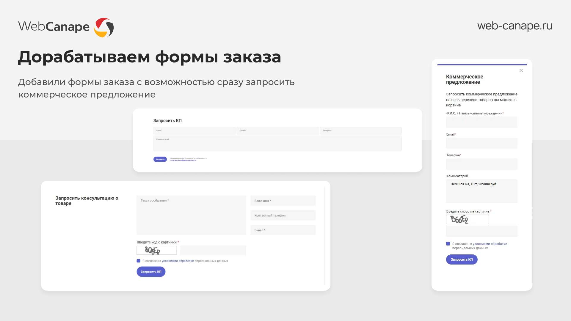 Основная целевая аудитория Edusnab — государственные и бюджетные учебные заведения. При поиске и закупке оборудования на сайтах такого типа, как правило, используют формы заказа. Это удобно, т.к. можно сразу приложить документ со списком необходимых позиций. На сайте Edusnab ничего подобного реализовано не было. Поэтому мы добавили формы заказа с возможностью сразу запросить коммерческое предложение.