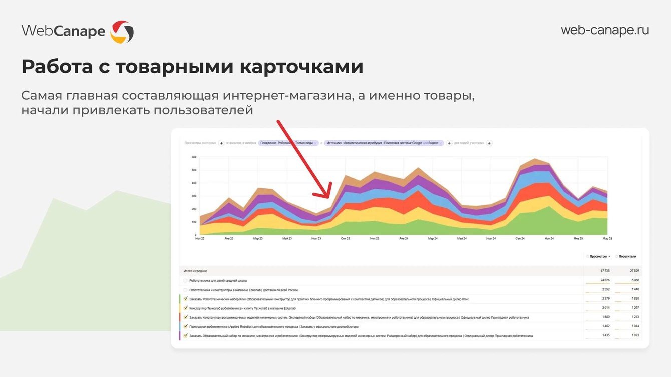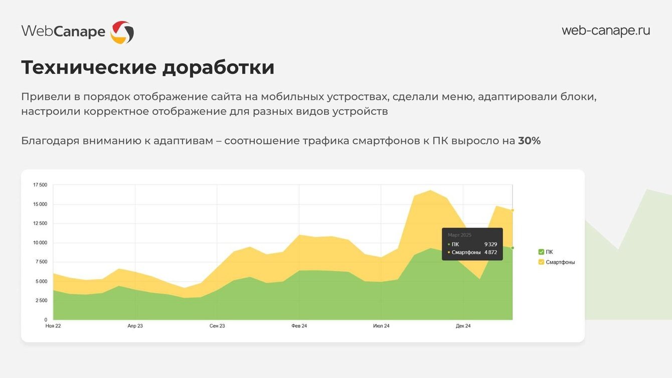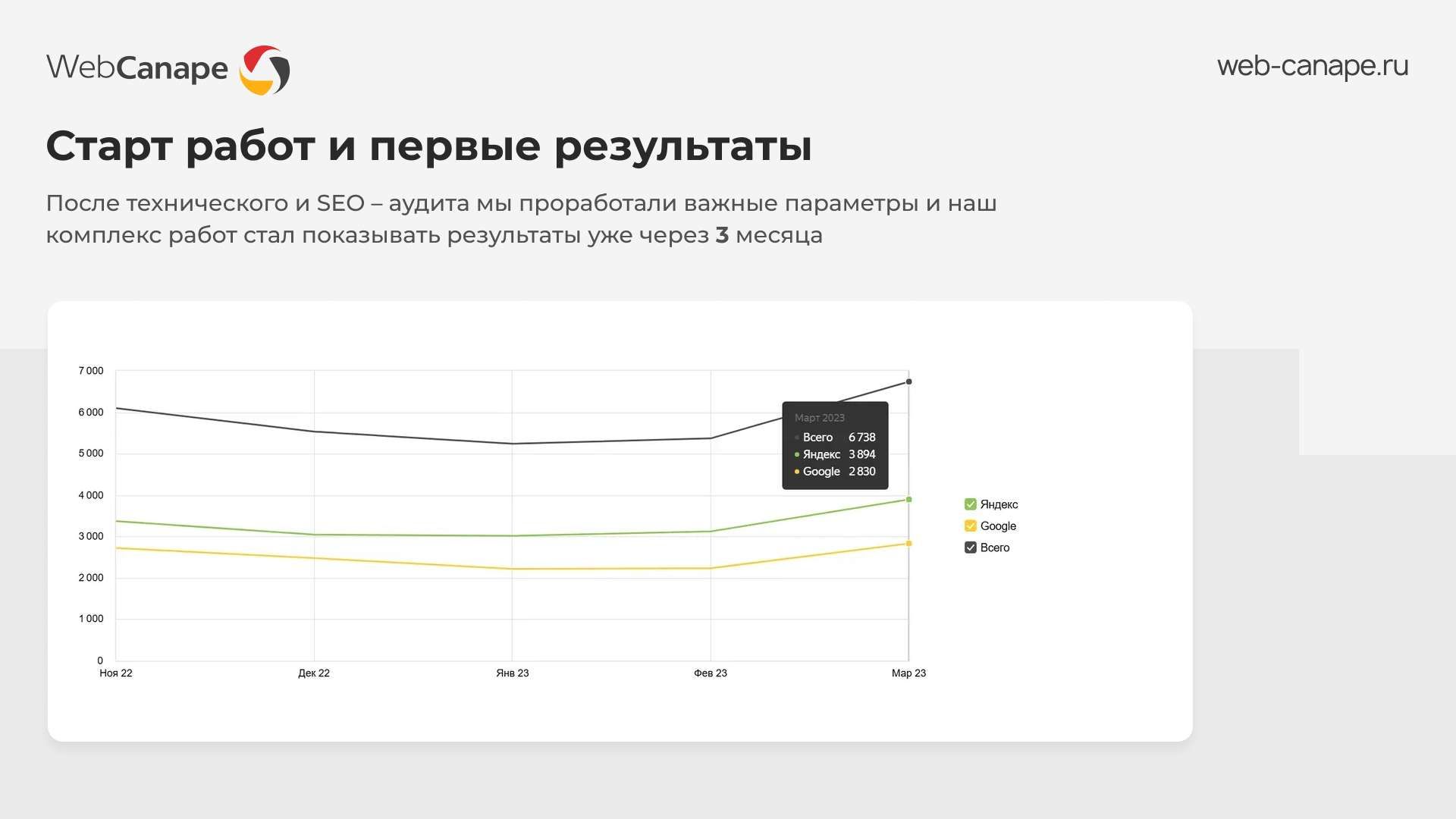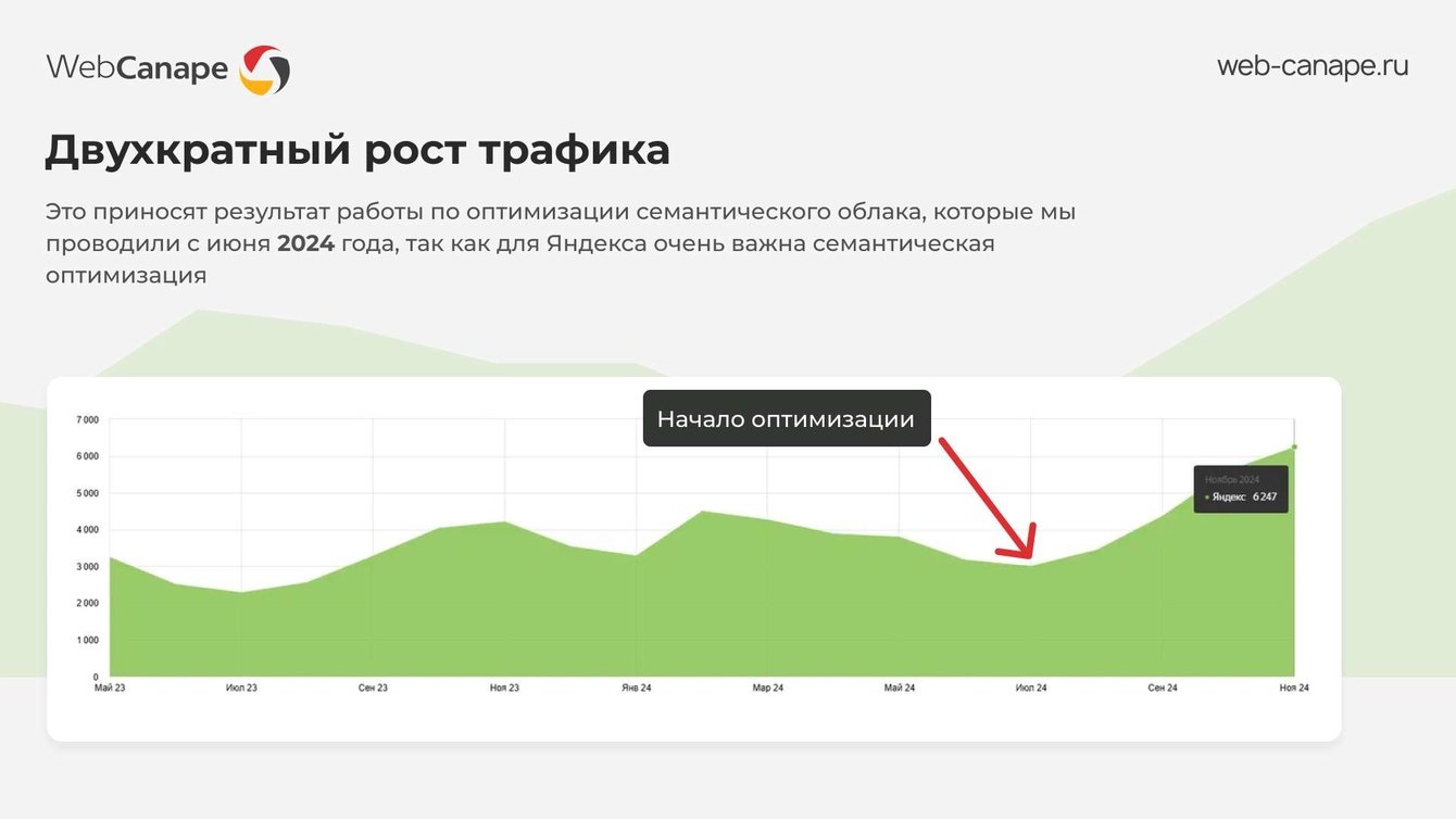 Стратегия SEO-продвижения, которую мы разработали на старте, дала стабильный и измеримый результат. Мы устранили технические проблемы, усилили структуру сайта, переработали карточки и тексты, подключили статейное продвижение, чтобы решить задачи клиента.