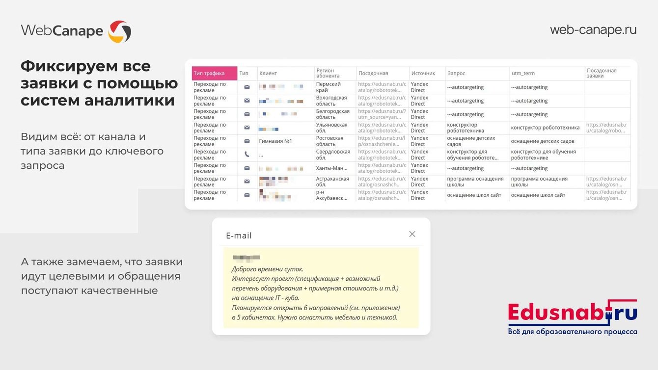 Это подтверждает наш кейс с компанией Edusnab. Четкое планирование, последовательная работа, в том числе тестирование разных инструментов и своевременный отказ от неэффективных, позволили нам не только в 2,5 раза увеличить трафик на сайт и количество поступаемых с поиска заявок, а также приводить стабильные лиды с рекламы и снизить стоимость заявки в 4 раза. Постоянная оптимизация рекламных кампании помогли уменьшить цену лида и повысить качество трафика.