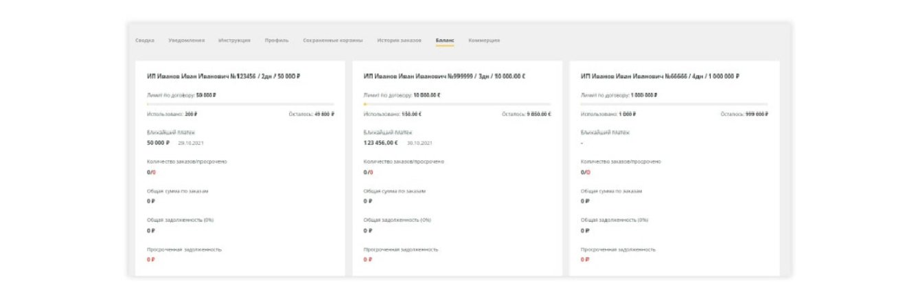 Внутри личного кабинета администратор компании может добавлять или деактивировать клиентов, управлять своими договорами, сохранять корзины, добавлять сотрудников и назначать им роли, управлять доступом к различным разделам.
