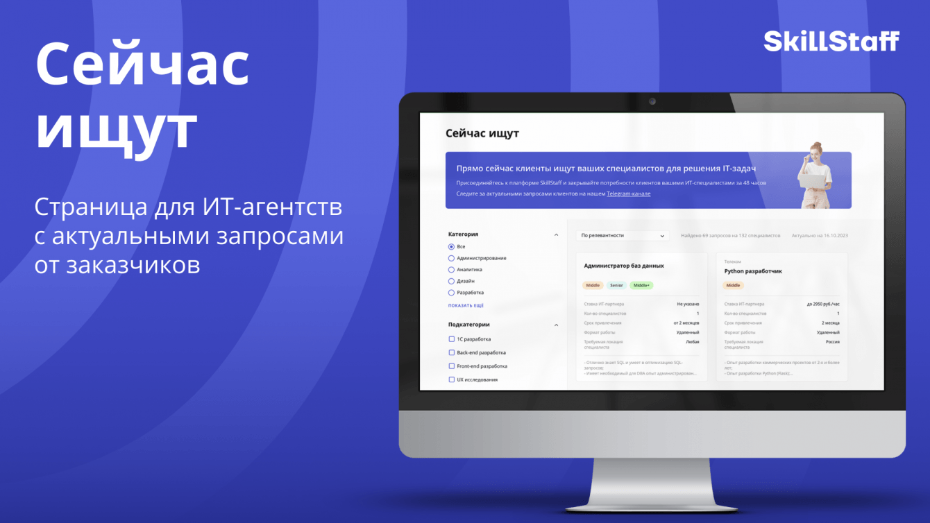 — на странице «Сейчас ищут» в моменте находится до 150 вакансий специалистов на аутстаф. Это дает прозрачную возможность для агентств разного размера дотянуться до своего клиента и зарабатывать больше.