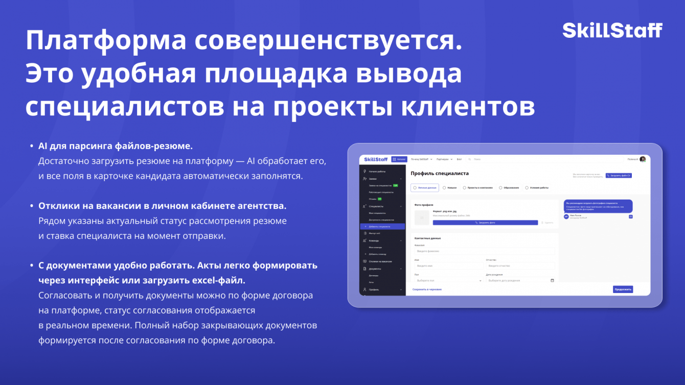 SkillStaff — это B2B-маркетплейс для поиска ИТ-профессионалов по модели аутстаффинга, который объединяет агентства и клиентов с 2021 года.