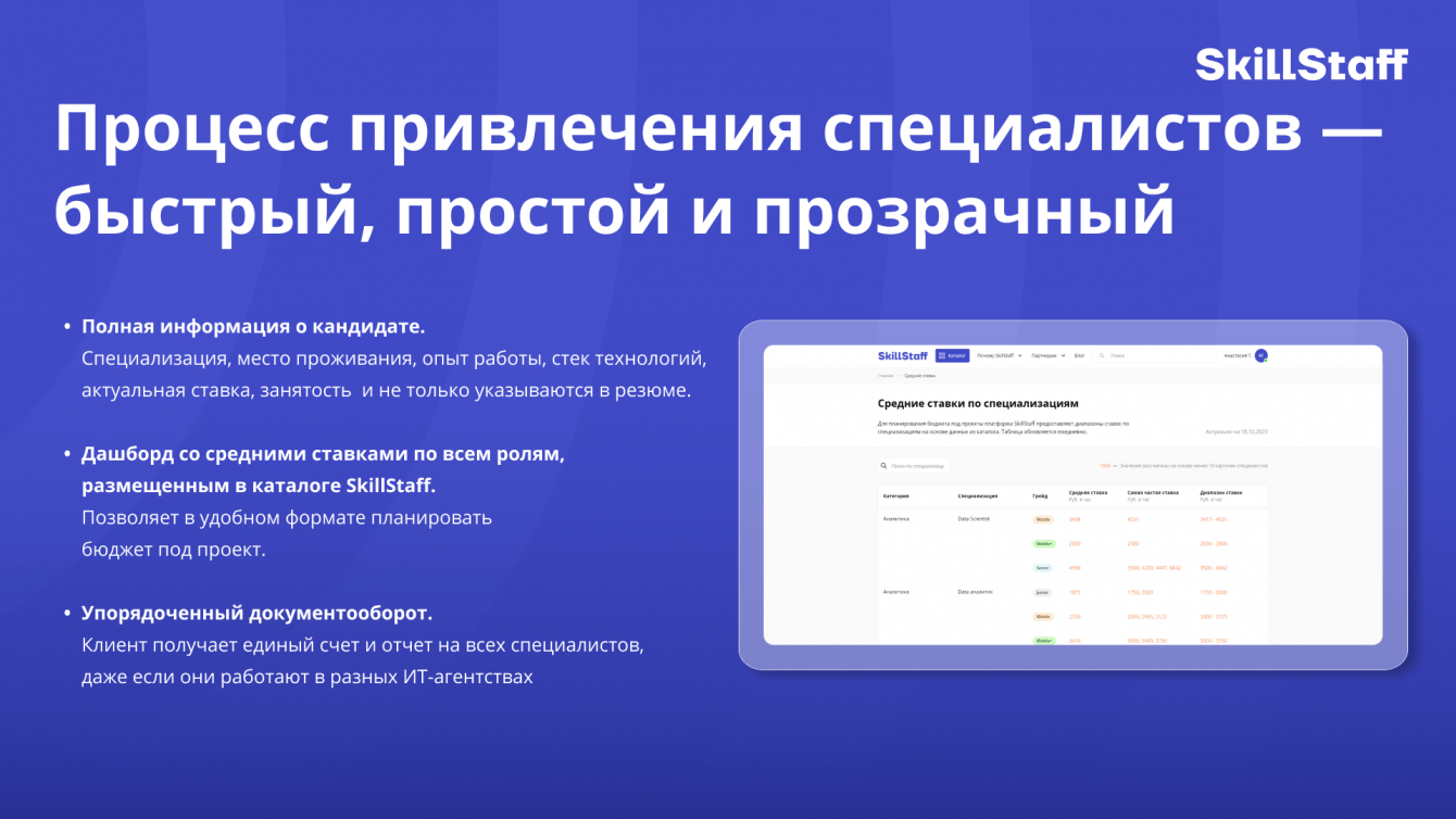 — мы реализовали раздел «Средние ставки по специализациям» (https://skillstaff.ru/average-rates ), который на основе массива данных дает усредненную текущую картину рынка по средним ставкам, грейдам и специализациям. Это дает рынку еще больше прозрачности для работы с аутстаф-поставщиками.